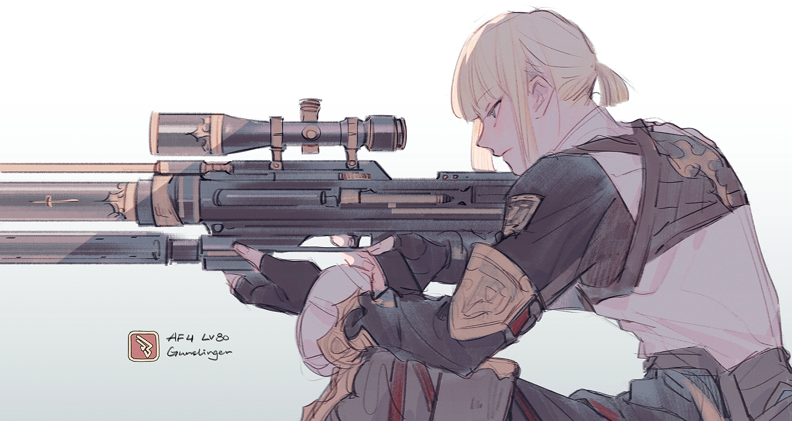 1boy black_gloves blonde_hair blunt_bangs blunt_ends closed_mouth crim0x0 crossover final_fantasy final_fantasy_xiv finger_on_trigger fingerless_gloves from_side frown gloves grey_background gun highres holding holding_gun holding_weapon job_icon_(final_fantasy) long_sleeves looking_ahead machinist_(final_fantasy) male_focus ponytail rifle rook_hunt scope serious shirt short_hair simple_background sniper_rifle solo twisted_wonderland weapon white_shirt