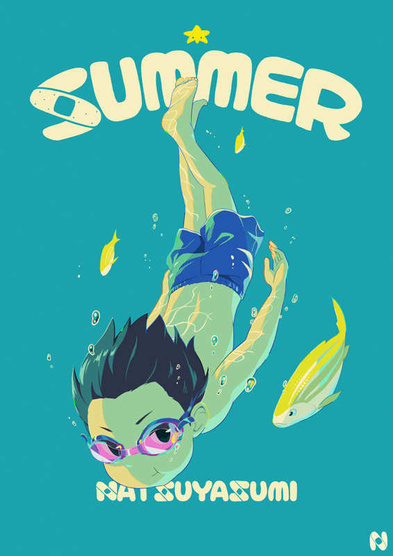 1boy air_bubble aqua_background barefoot black_hair blue_shorts bubble caustics child english_text fish goggles male_focus noeyebrow_(mauve) original romaji_text short_hair shorts simple_background soles solo swim_goggles swimming topless_male underwater
