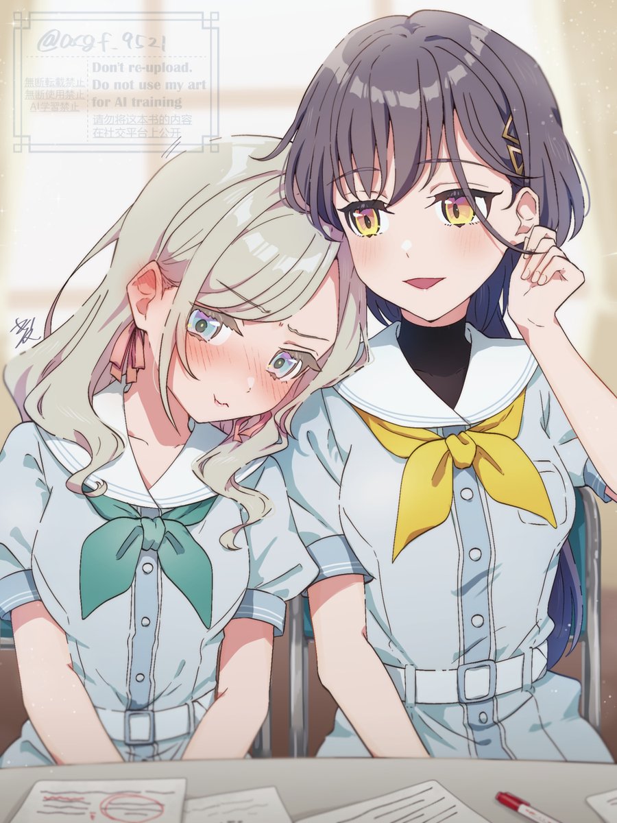 2girls :d aqua_neckerchief averting_eyes black_hair blue_dress blue_eyes blurry blurry_background blush breast_pocket breasts ceras_yanagida_lilienfeld chair commentary_request day dress edel_note folding_chair gradient_eyes grey_hair hair_ornament hair_ribbon hasu_no_sora_school_uniform head_on_another's_shoulder highres indoors katsuragi_izumi kyaku_tasu leaning_on_person leaning_to_the_side link!_like!_love_live! long_hair looking_at_another love_live! medium_breasts multicolored_eyes multiple_girls neckerchief on_chair open_mouth pink_ribbon pocket puffy_short_sleeves puffy_sleeves purple_eyes ribbon sailor_collar sailor_dress school_uniform short_sleeves sidelocks sitting smile summer_uniform swept_bangs table triangle_hair_ornament turtleneck virtual_youtuber watermark white_sailor_collar window wolf_cut yellow_eyes yellow_neckerchief