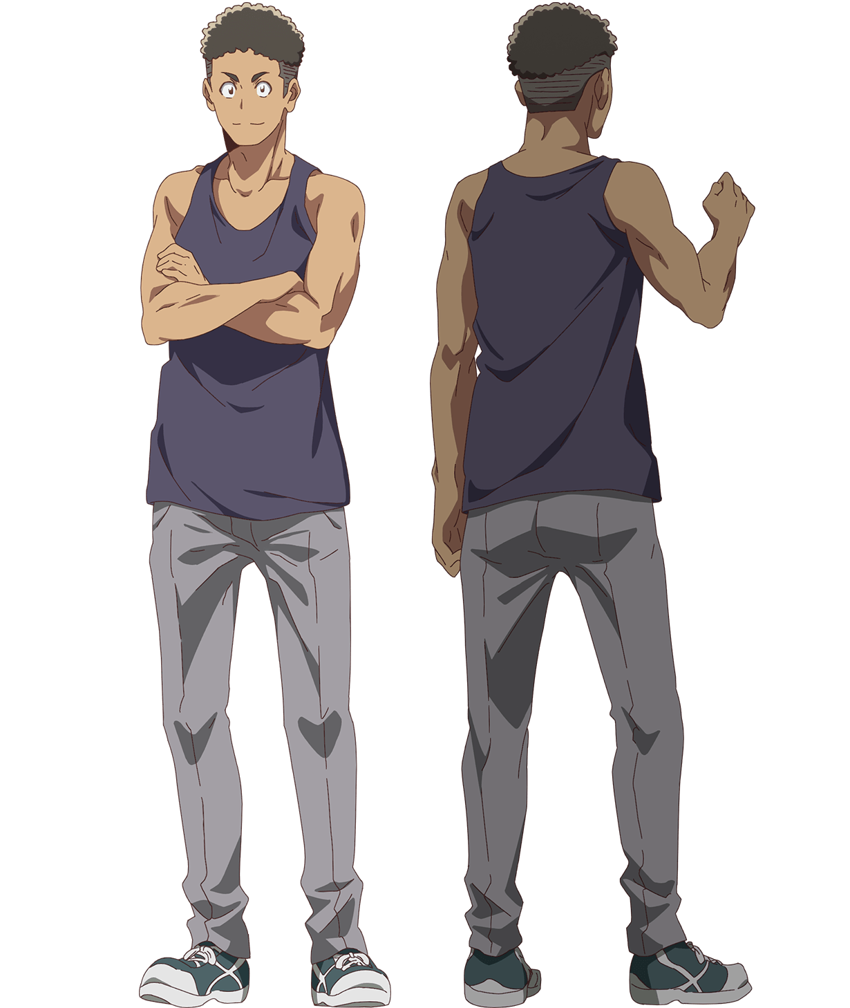 1boy anime_coloring back bare_shoulders black_tank_top clenched_hands closed_mouth collarbone crossed_arms dark_skin grey_pants highres hitoribocchi_no_isekai_kouryaku jocks_c_(hitoribocchi_no_isekai_kouryaku) looking_at_viewer multiple_views muscular muscular_male nakano_keiya official_art pants shoes short_hair simple_background smile sneakers solo standing tank_top transparent_background very_short_hair