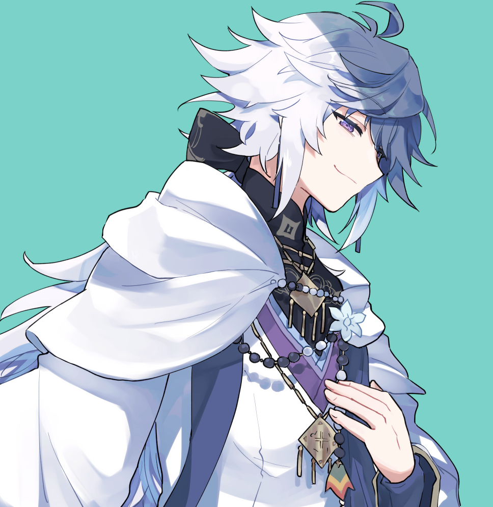 1boy ahoge amachi_(yuuin) aqua_background black_bow black_jacket bow chinese_clothes closed_mouth earrings fate/grand_order fate_(series) hair_bow half-closed_eyes hand_on_own_chest high_collar jacket jewelry long_hair long_sleeves looking_at_viewer male_focus mandarin_collar merlin_(concept_dress)_(fate) merlin_(fate) necklace ponytail purple_eyes robe simple_background smile solo tangzhuang upper_body white_hair white_robe