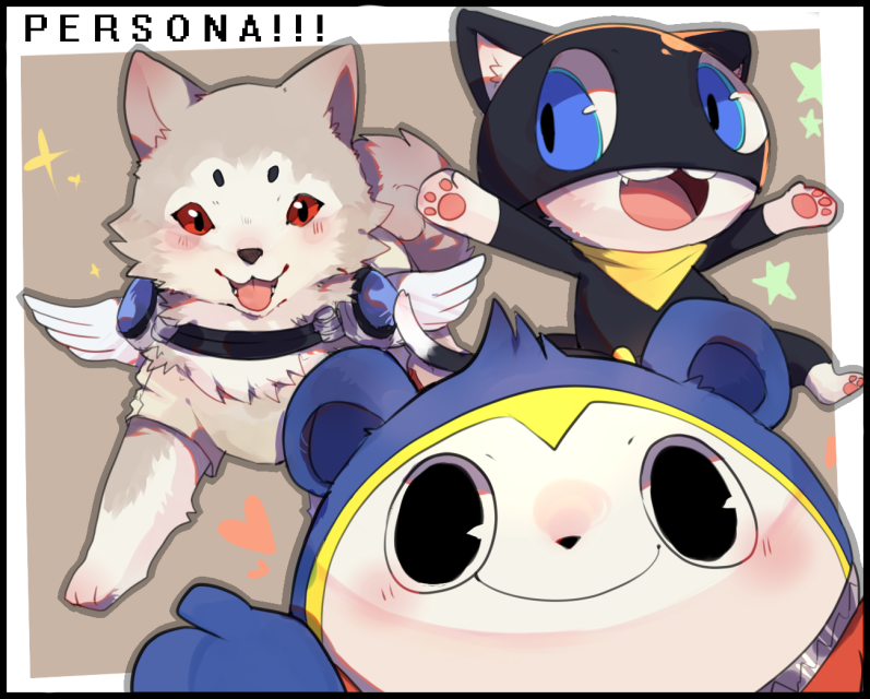 :3 bandana black_eyes border cat closed_mouth copyright_name dog gtnsnin99 koromaru_(persona) kuma_(persona_4) morgana_(persona_5) open_mouth pawpads persona persona_3 persona_4 persona_5 red_eyes smile white_border yellow_bandana