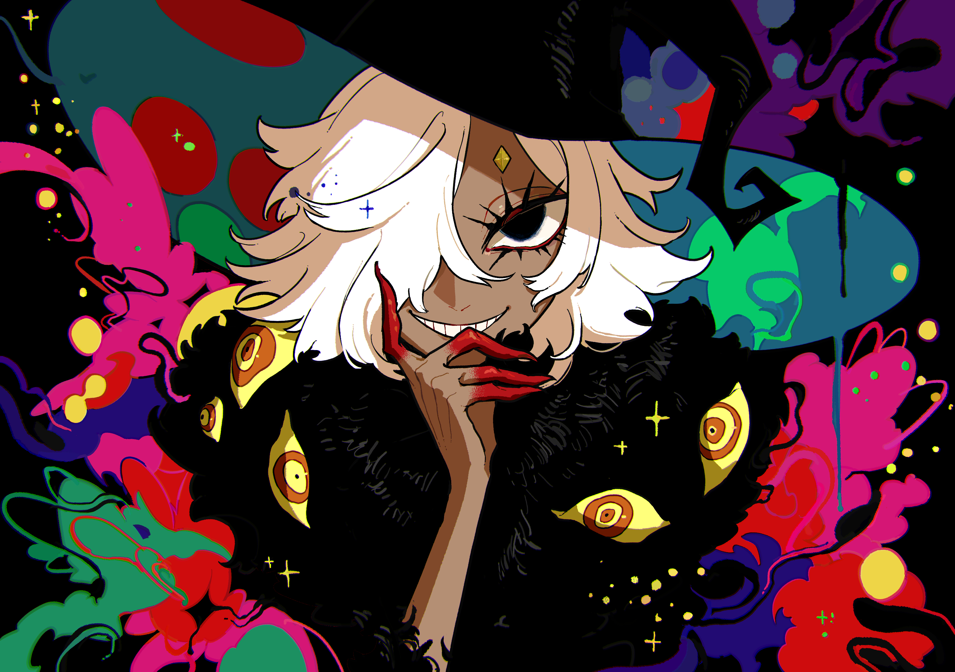 absurdres black_background black_eyes black_fur black_hat blonde_hair colored_sclera colored_skin colored_smoke dark_skin evil_grin evil_smile fingernails forehead_jewel fur_collar gem green_hat grin hair_over_one_eye hand_on_own_chin hat highres long_eyelashes long_fingernails looking_at_viewer momomo_906 original red_eyes red_nails red_skin ringed_eyes sharp_fingernails short_hair smile smoke sparkle too_many_eyes two-sided_fabric two-sided_headwear wide_brim witch_hat yellow_eyes yellow_gem yellow_sclera