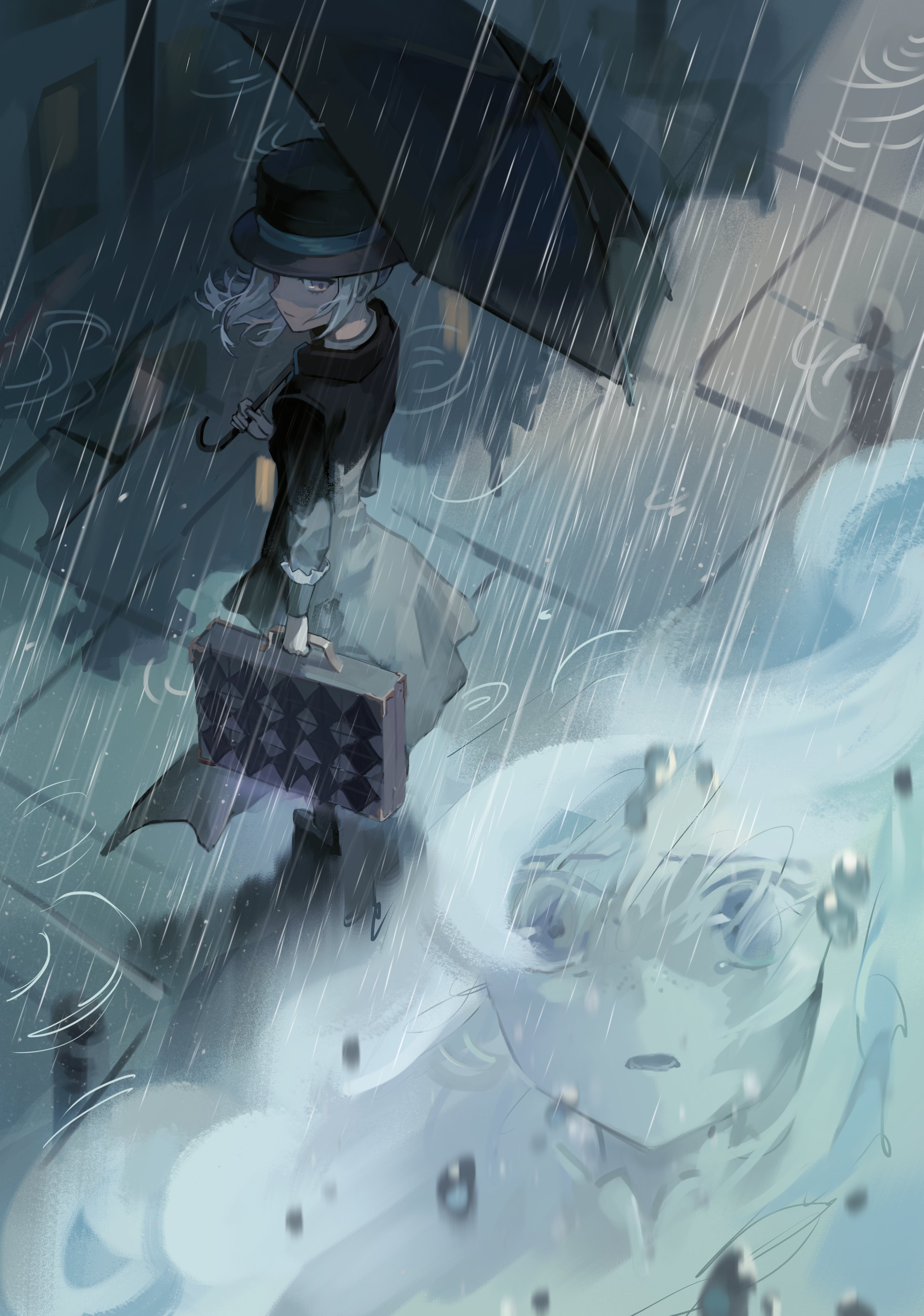 1girl absurdres black_boots black_coat black_hat black_umbrella boater_hat boots coat different_reflection from_above grey_eyes grey_hair hat highres holding holding_suitcase holding_umbrella looking_at_viewer puddle rain reflection reverse:1999 ripples short_hair suitcase tile_floor tiles umbrella vertin_(reverse:1999) yuckpo_(jerky_55)