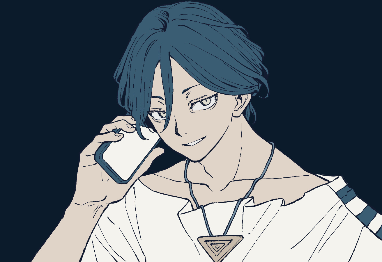1boy blue_background blue_theme chinese_commentary commentary_request hair_between_eyes hand_up holding holding_phone looking_at_viewer male_focus meguriya_ayumu monochrome phone rokkatera short_hair simple_background smile solo toshi_densetsu_kaitai_center triangle_necklace upper_body