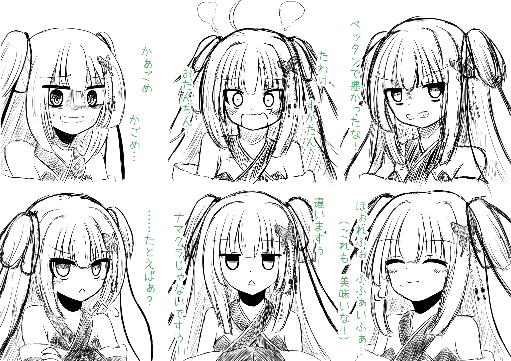 1girl @_@ ^_^ ahoge angry bare_shoulders blunt_bangs blunt_ends blush butterfly_hair_ornament clenched_teeth closed_eyes closed_mouth commentary_request criss-cross_halter embarrassed fang food food_on_face frown hair_ornament hair_ribbon halterneck happy highres hime_cut jitome long_hair looking_at_viewer monochrome multiple_expressions multiple_views murasame_(senren) open_mouth puff_of_air ribbon scared senren_banka shaded_face sidelocks simple_background sketch smile split_mouth sweatdrop teeth translation_request triangle_mouth two_side_up umiasu upper_body v-shaped_eyebrows wavy_mouth white_background wide-eyed