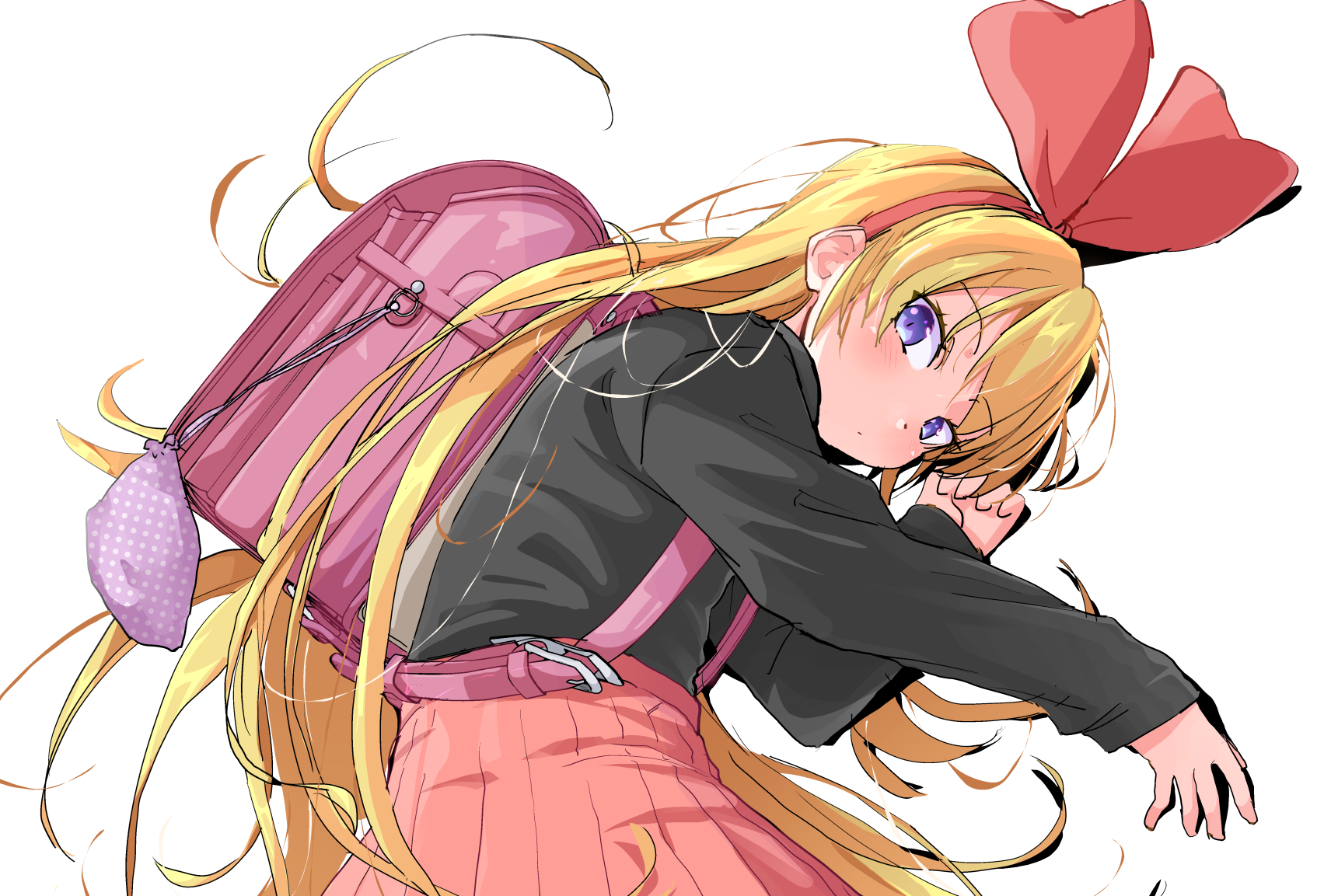 1girl backpack bag black_shirt blonde_hair bow bow_hairband closed_mouth commentary_request dokidoki!_precure hair_bow hairband high-waist_skirt highres kakkuu_(clutch_shot_king) large_bow long_hair long_sleeves looking_at_viewer lying on_side pink_bag pink_skirt precure purple_eyes randoseru red_bow red_hairband regina_(precure) shirt simple_background skirt solo very_long_hair white_background