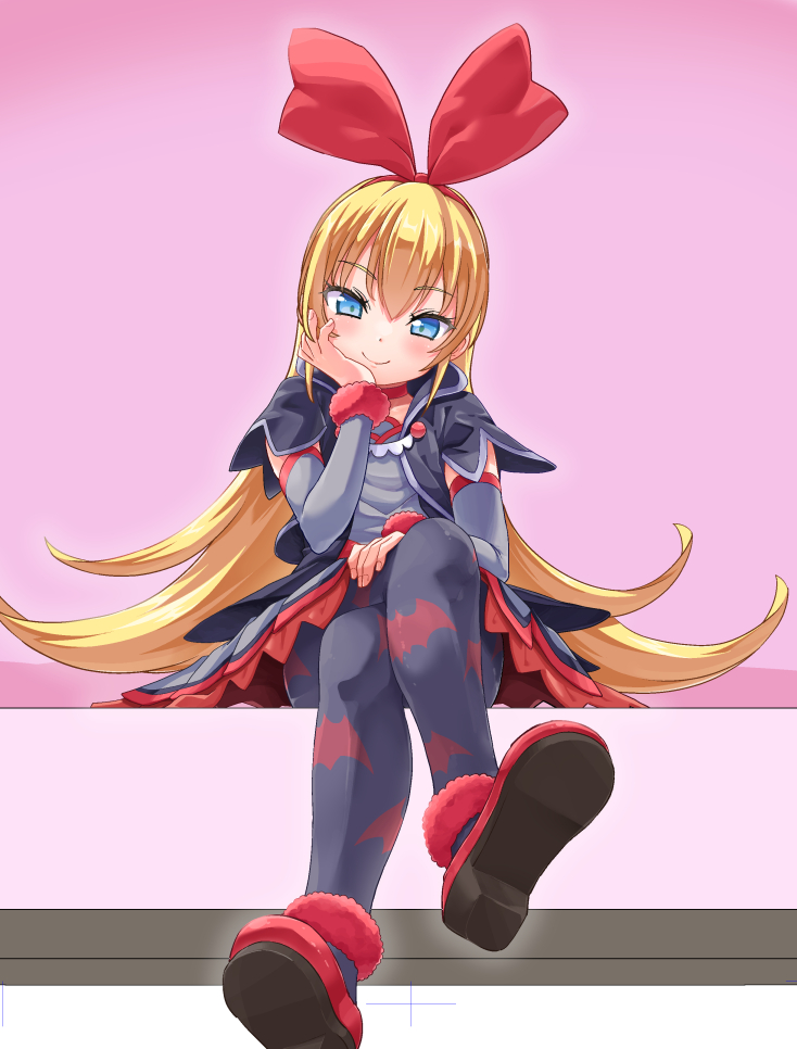 1girl animal_print anklet bat_print black_jacket black_pantyhose blonde_hair blue_eyes bow bow_hairband choker closed_mouth commentary_request crossed_legs detached_sleeves dokidoki!_precure dress flipped_hair full_body fur-trimmed_sleeves fur_trim grey_dress grey_sleeves hair_bow hairband hand_on_own_cheek hand_on_own_face jacket jewelry kakkuu_(clutch_shot_king) large_bow long_hair long_sleeves looking_at_viewer open_clothes open_jacket pantyhose precure print_pantyhose red_bow red_choker red_hairband red_shoes regina_(precure) shoe_soles shoes short-sleeved_jacket short_sleeves smile solo very_long_hair