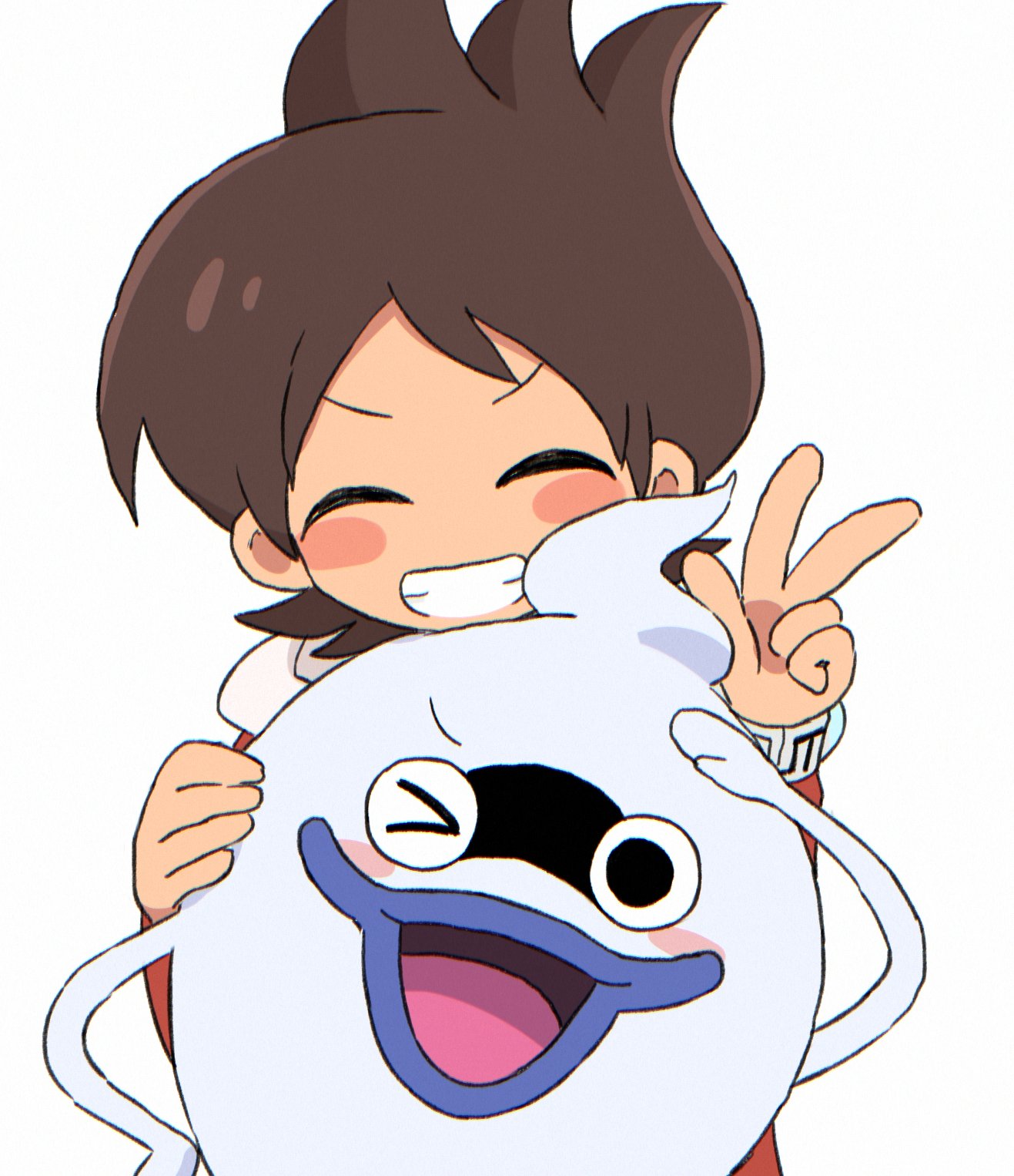 1boy amano_keita blush_stickers brown_hair closed_eyes ghost grin highres koko_ue one_eye_closed open_mouth red_shirt salute shirt short_hair short_sleeves simple_background smile v whisper_(youkai_watch) white_background youkai_(youkai_watch) youkai_watch