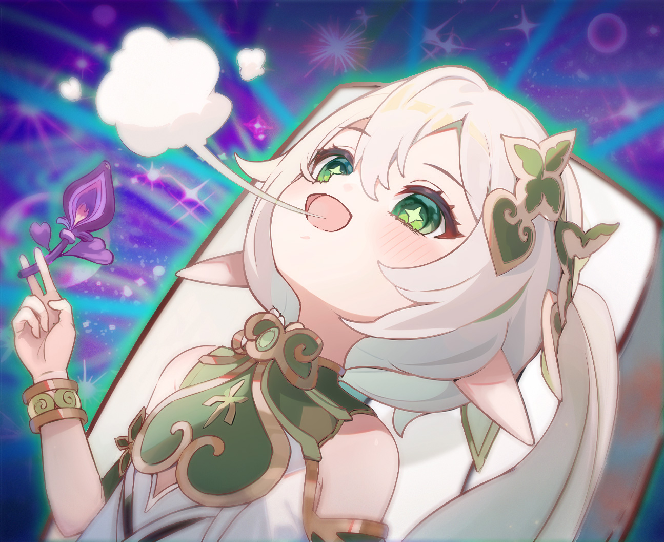 1girl bracelet chinese_commentary commentary_request cross-shaped_pupils dress drugs genshin_impact green_eyes green_hair hair_between_eyes hand_up holding holding_plant jewelry kong_zhi_xian_yu long_hair looking_at_viewer multicolored_hair nahida_(genshin_impact) naku_weed open_mouth plant pointy_ears purple_background side_ponytail smile smoke smoking solo sparkle symbol-shaped_pupils upper_body v white_dress white_hair