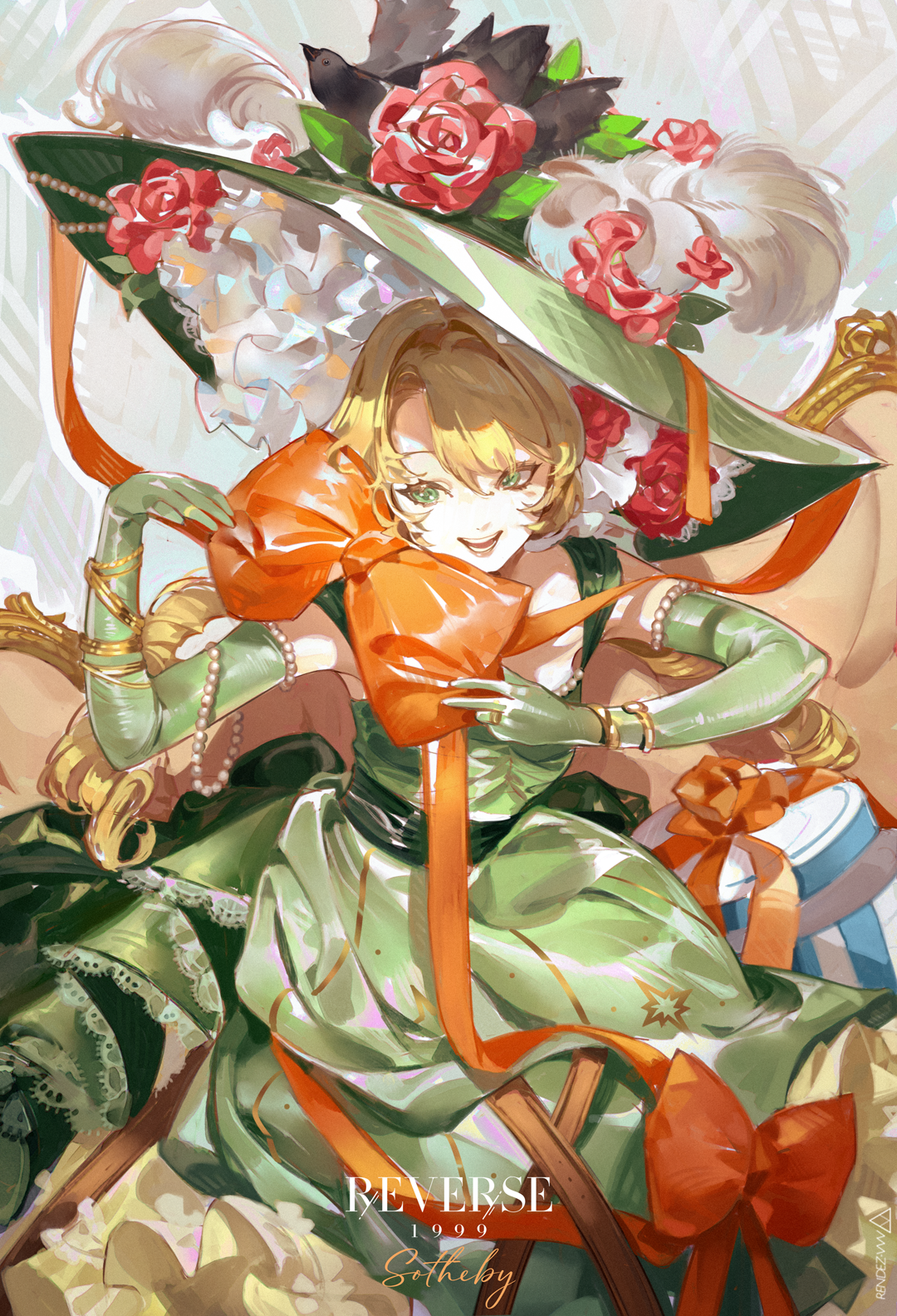 1girl :d bare_shoulders blonde_hair bow character_name chinstrap copyright_name dress drill_hair elbow_gloves facing_viewer flower gloves green_dress green_eyes green_gloves green_hat hands_up hat hat_feather hat_flower highres logo long_hair looking_to_the_side low_twintails open_mouth orange_bow picture_hat red_flower red_rose reverse:1999 rose sleeveless sleeveless_dress smile solo sotheby teeth twin_drills twintails upper_body vvv_rendez