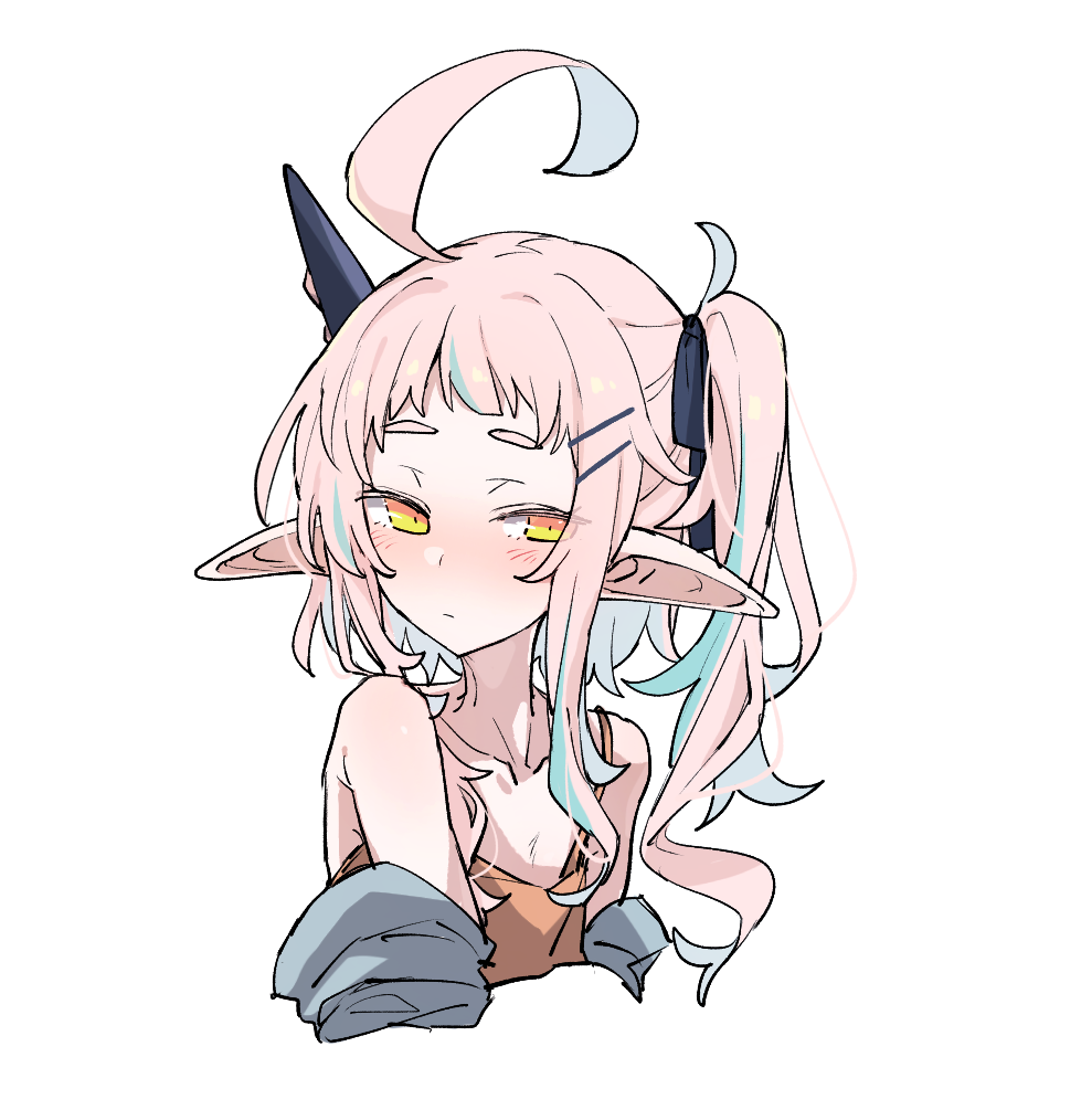 1girl ahoge armpit_crease azuma_shino bare_shoulders blue_hair blush closed_mouth cropped_arms cropped_torso horns huge_ahoge light_blush long_hair long_pointy_ears looking_at_viewer multicolored_hair orange_eyes orange_tank_top original pink_hair pointy_ears ponytail repi_(azuma_shino) shiny_skin side_ponytail simple_background single_horn solo spaghetti_strap streaked_hair tank_top two-tone_hair upper_body very_long_ears white_background