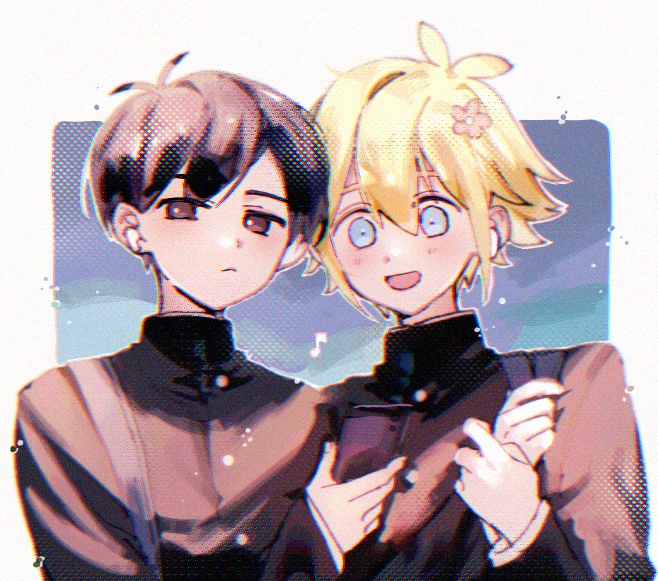 2boys alternate_costume antenna_hair bag basil_(faraway)_(omori) basil_(omori) black_eyes black_hair blonde_hair blue_eyes blush cellphone closed_mouth duffel_bag flower hair_flower hair_ornament long_sleeves looking_at_viewer male_focus multiple_boys musical_note omori open_mouth phone school_uniform short_hair smartphone smile sunny_(omori) usagi_uma_te_mu