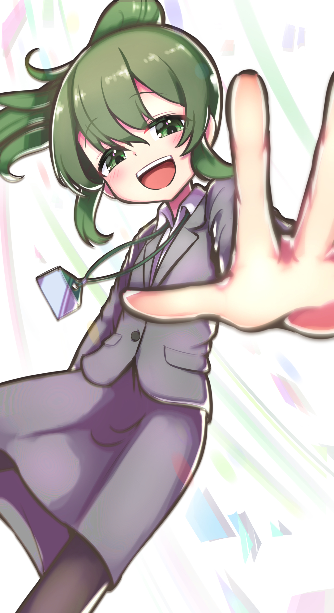 1girl black_pantyhose collared_shirt commentary_request formal_clothes green_eyes green_hair grey_jacket grey_skirt highres id_card igarashi_futaba jacket long_hair looking_at_viewer mellow_yellow_(my_kakukaku) office_lady open_mouth outstretched_arm pantyhose ponytail reaching reaching_towards_viewer senpai_ga_uzai_kouhai_no_hanashi shirt skirt skirt_suit smile solo suit