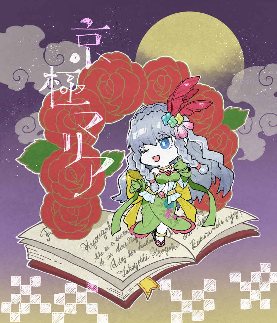 1girl :d blue_eyes book braid character_name chibi chibi_only crown_braid crtr_melco feather_hair_ornament feathers flower full_moon gloves green_gloves green_skirt grey_hair hair_ornament kyougoku_maria_(sengoku_basara) long_hair looking_ahead moon open_book open_mouth pink_sandals red_flower red_rose rose sandals sengoku_basara skirt smile solo twin_braids