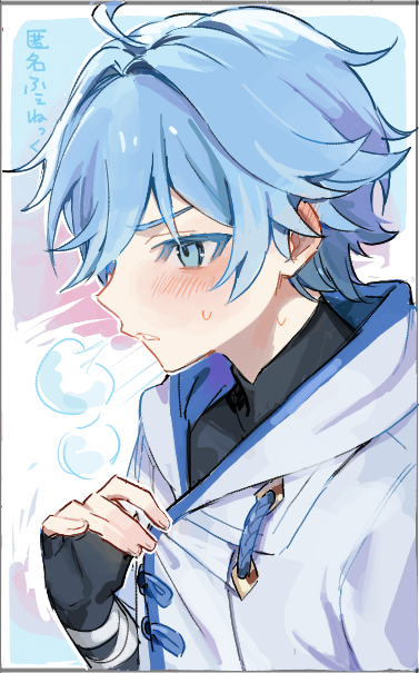 1boy bandaged_arm bandages black_bodysuit black_gloves blue_eyes blue_hair blush bodysuit border chongyun_(genshin_impact) fingerless_gloves genshin_impact gloves hair_between_eyes hood hood_down kaawaisann male_focus profile puff_of_air simple_background solo sweat upper_body