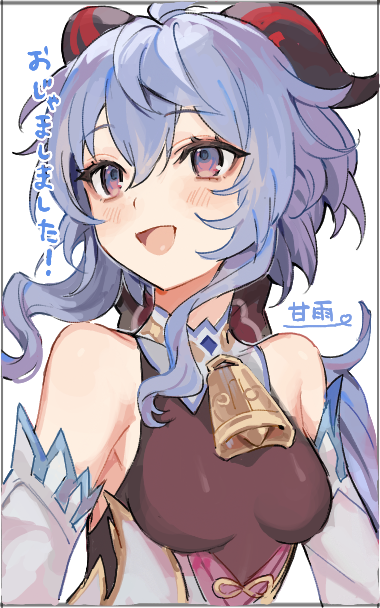 1girl bare_shoulders bell black_bodysuit blue_hair blush bodysuit border breasts character_name cowbell detached_sleeves eyelashes ganyu_(genshin_impact) genshin_impact hair_between_eyes horns kaawaisann long_hair medium_breasts neck_bell open_mouth purple_eyes simple_background solo upper_body white_background