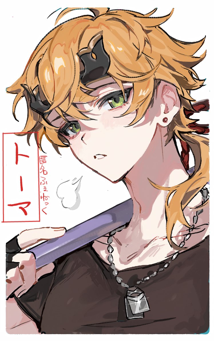 1boy black_gloves black_shirt blonde_hair blush commentary_request dog_tags earrings fake_horns fingerless_gloves genshin_impact gloves green_eyes hair_between_eyes hair_ribbon headband holding horned_headwear horns jewelry kaawaisann long_hair looking_at_viewer male_focus parted_lips ponytail puff_of_air red_ribbon ribbon shirt simple_background solo stud_earrings thoma_(genshin_impact) translation_request upper_body white_background