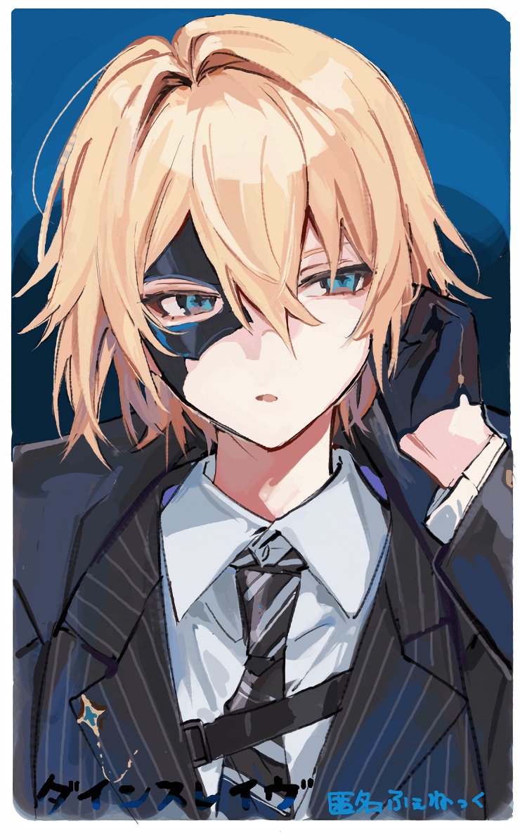 1boy black_gloves black_jacket black_necktie blonde_hair blue_eyes character_name collared_shirt commentary_request dainsleif_(genshin_impact) genshin_impact gloves hair_between_eyes jacket kaawaisann long_sleeves male_focus necktie parted_lips shirt simple_background solo striped_clothes striped_necktie upper_body white_shirt