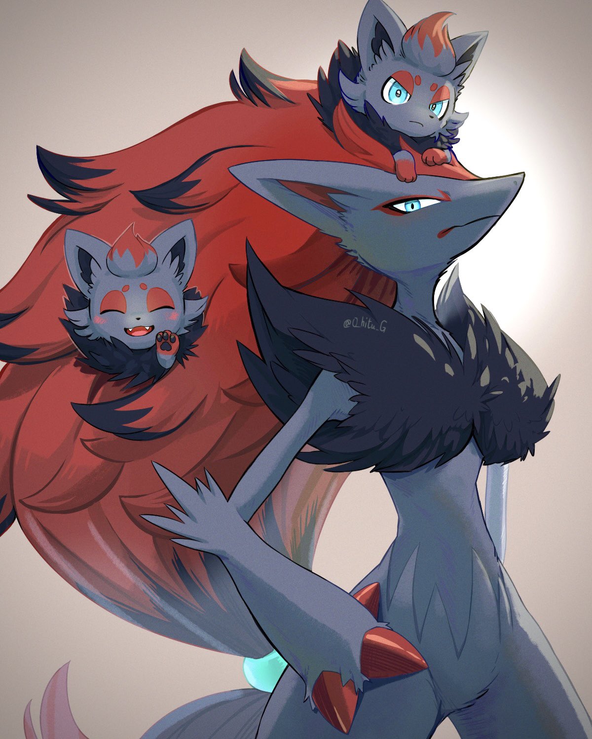 ^_^ artist_name black_fur black_hair blue_eyes claws closed_eyes closed_mouth commentary cowboy_shot evolutionary_line fangs furry gen_5_pokemon grey_background hair_ornament hand_on_own_hip highres long_hair looking_at_viewer low-tied_long_hair nintendo o_hitu_g on_head open_mouth pawpads pokemon pokemon_(creature) pokemon_on_head red_fur red_hair smile sphere_hair_ornament standing twitter_username two-tone_fur very_long_hair waving zoroark zorua