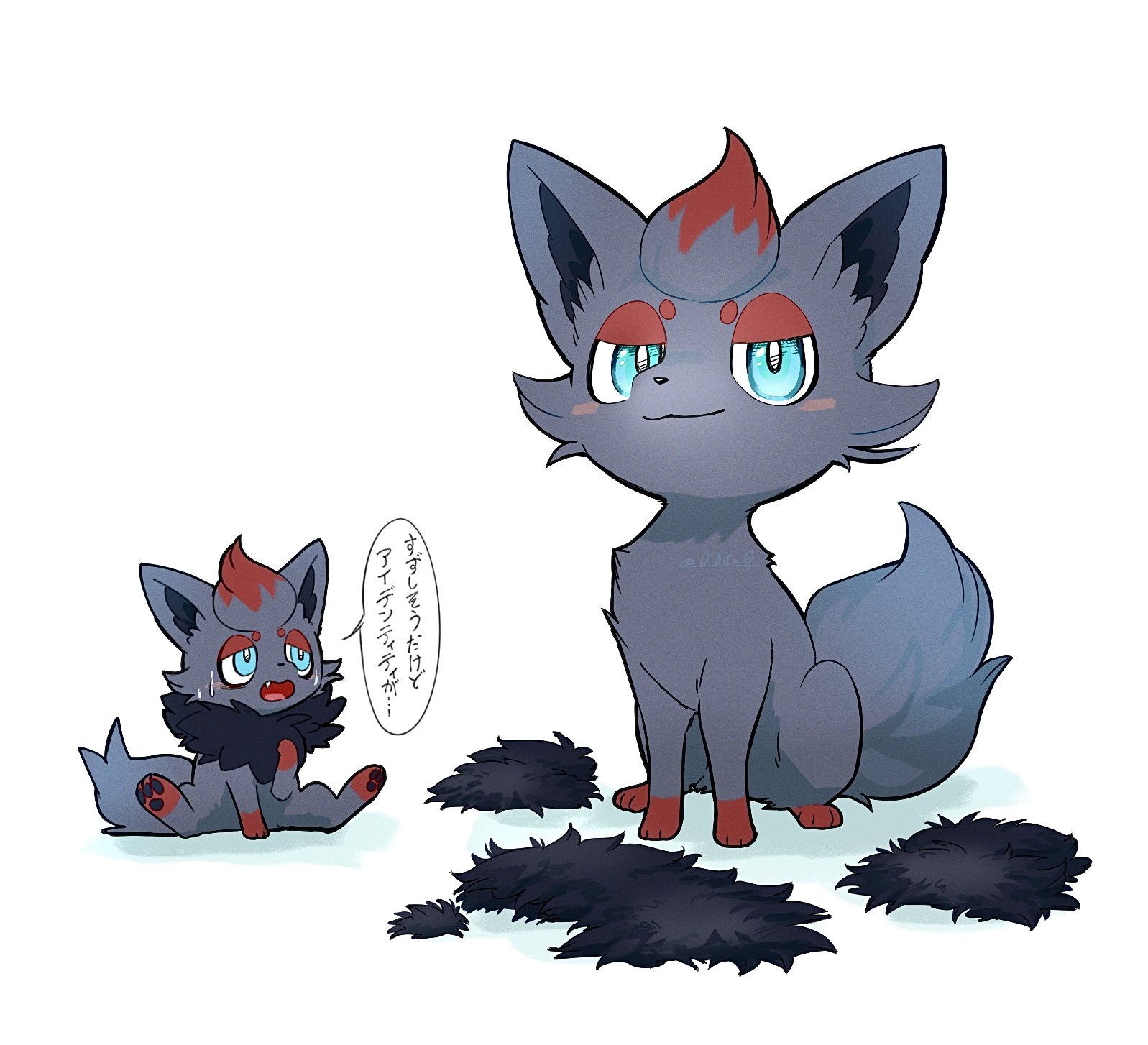 black_fur blue_eyes blush_stickers closed_mouth commentary fang full_body gen_5_pokemon highres looking_at_another looking_at_viewer nintendo no_humans o_hitu_g open_mouth pawpads pokemon pokemon_(creature) red_fur simple_background sitting smile standing sweat translated two-tone_fur white_background zorua