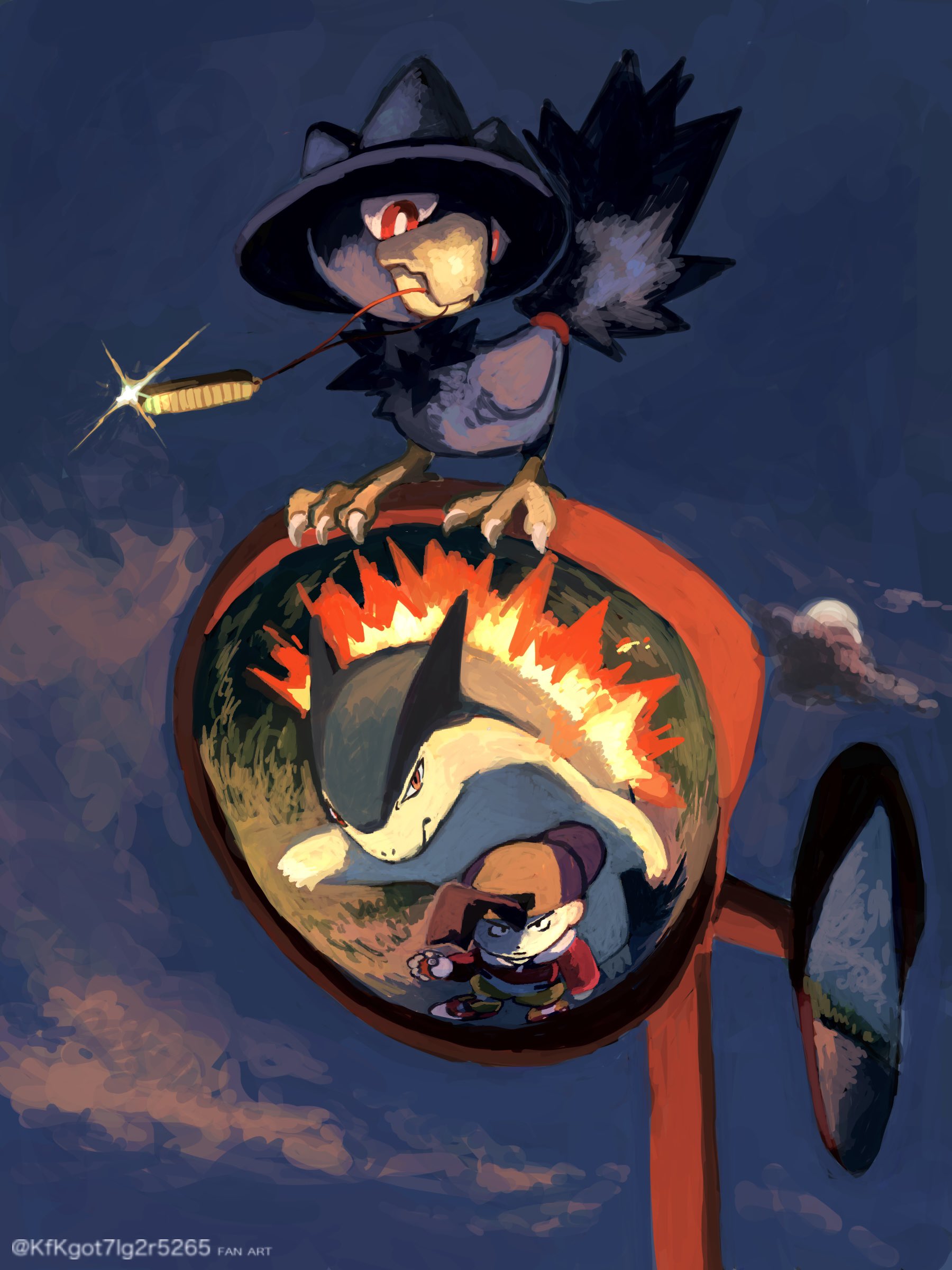 absurdres amulet_coin artist_name baseball_cap beak bird blue_feathers blue_sky cloud dusk ethan_(pokemon) feathers gen_2_pokemon gold_necklace hat highres jewelry kfkgot7ig2r5265 looking_at_another mouth_hold murkrow necklace nintendo outdoors pokemon pokemon_(creature) pokemon_gold/silver/crystal red_eyes reflection sky typhlosion