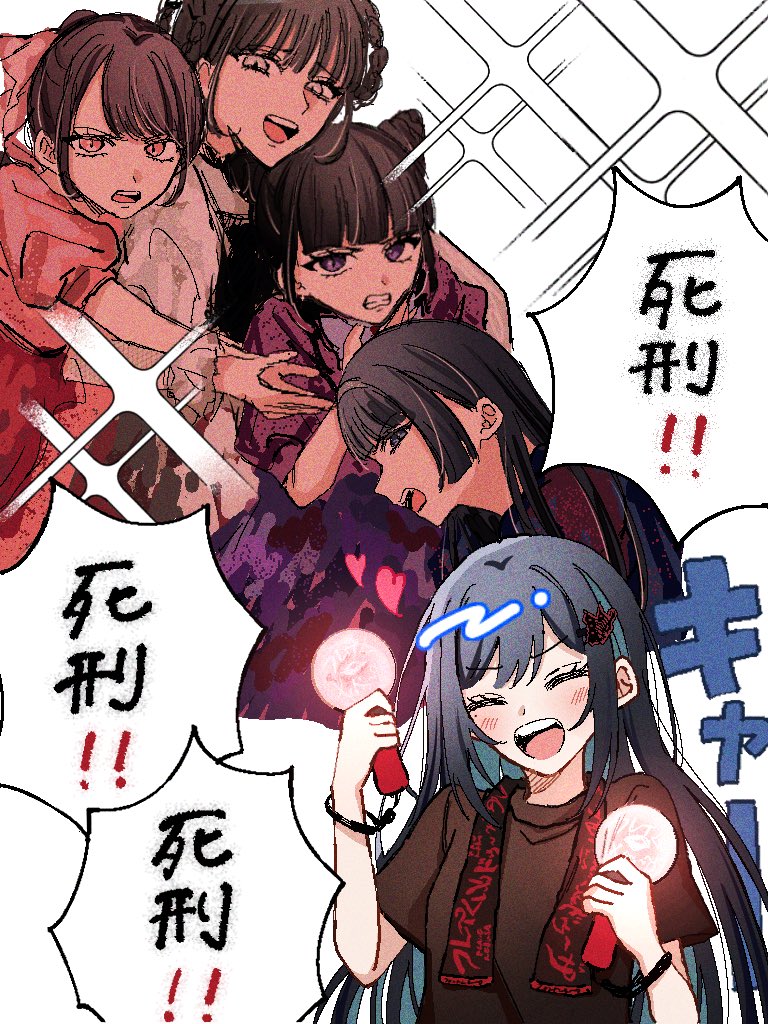 5girls ado_(utaite) black_hair black_shirt blue_hair blush chando_(ado) clenched_teeth closed_eyes colored_inner_hair commentary_request grey_eyes heart long_hair looking_at_viewer miu_(phantom_siita) mole mole_under_eye mona_(phantom_siita) multicolored_hair multiple_girls open_mouth oyashirazu_(adochan_daisuki) phantom_siita pink_shirt puffy_short_sleeves puffy_sleeves purple_eyes purple_shirt red_eyes rinka_(phantom_siita) shirt short_sleeves teeth translation_request utaite