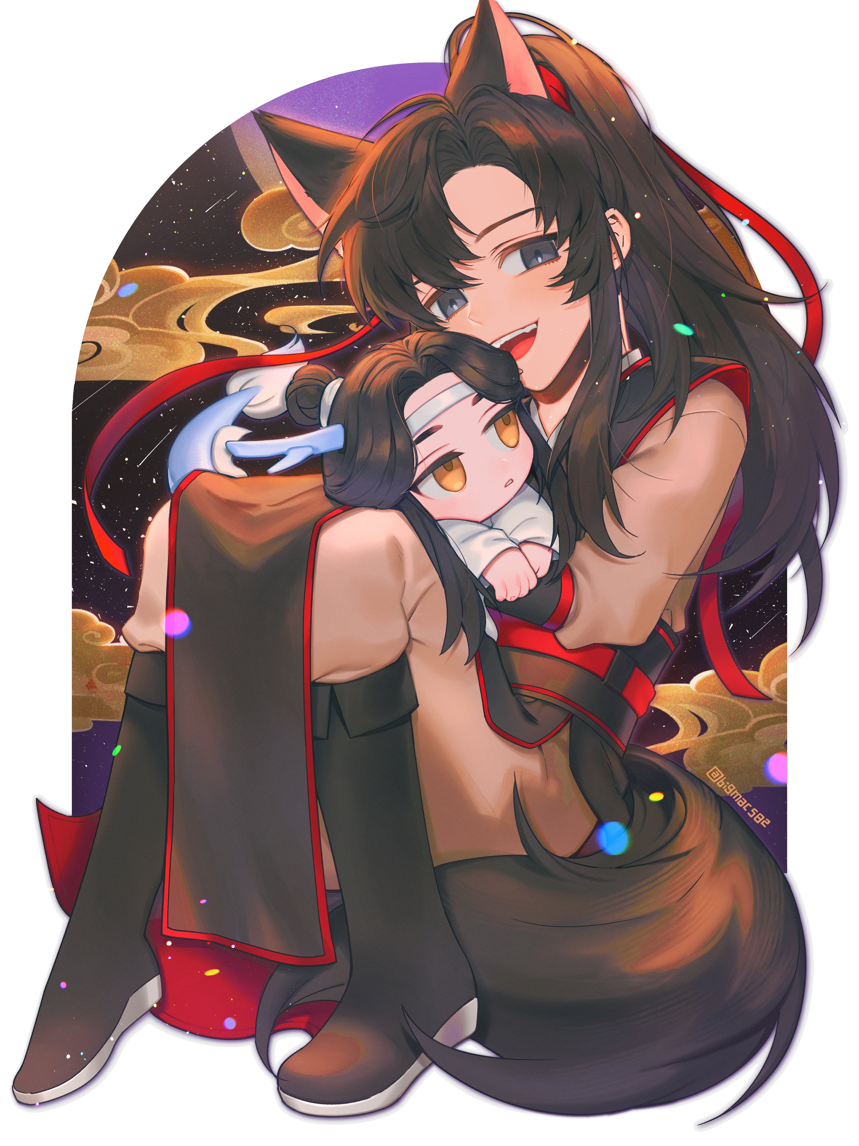 2boys :d absurdres adapted_costume aged_down animal_ears bigmac582 black_boots black_eyes black_hair black_hanfu boots brown_hair carrying carrying_person child child_carry chinese_clothes cloud confetti dragon_boy dragon_horns dragon_tail eastern_dragon_horns eastern_dragon_tail fox_boy fox_ears fox_tail full_body grey_pants hair_ribbon hanfu headband highres kemonomimi_mode knees_up lan_wangji light_particles long_hair long_sleeves looking_at_another looking_at_viewer male_focus modao_zushi multiple_boys open_mouth pants parted_lips ponytail red_ribbon red_sash ribbon sash sidelocks sitting sky smile tail teeth topknot tunic twitter_username upper_teeth_only wei_wuxian wei_wuxian_(yunmeng_clan) white_hanfu white_headband xiangyun yaoi yellow_eyes