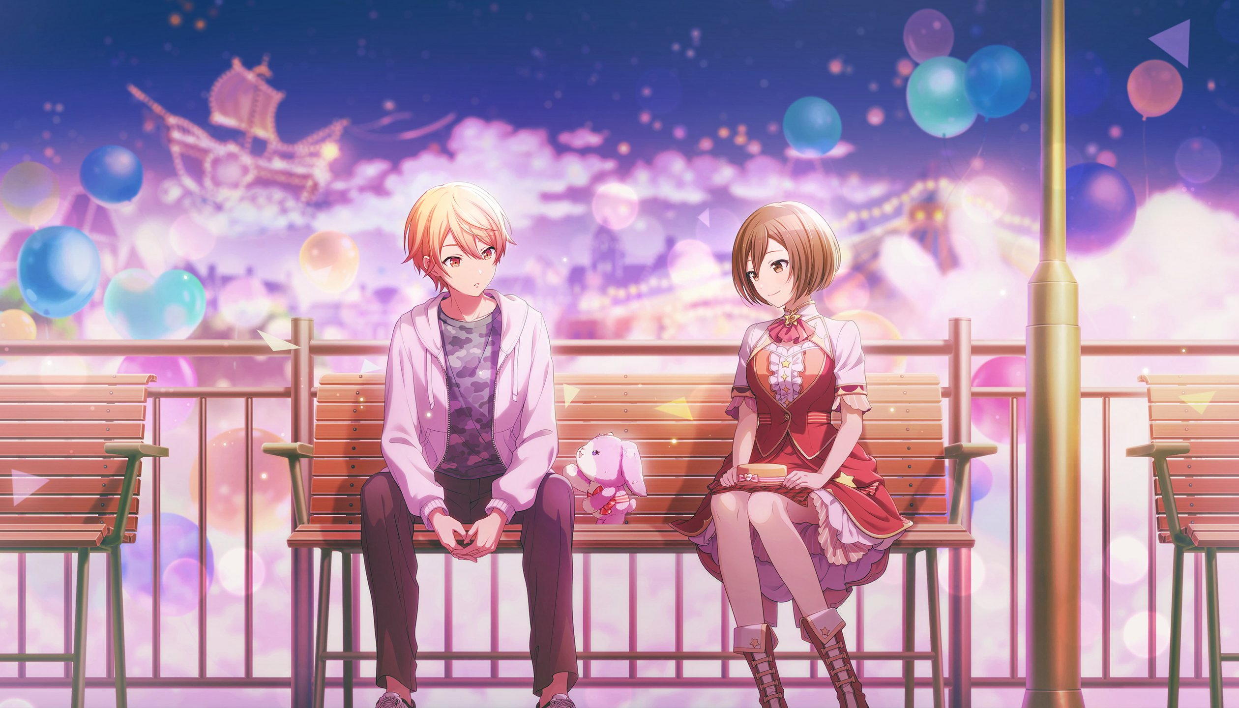 1boy 1girl balloon bench black_pants blurry blurry_background bokeh brown_eyes brown_hair brown_hat camouflage camouflage_shirt cloud colorful_palette depth_of_field dress frilled_dress frills game_cg grey_shirt hat highres holding holding_unworn_clothes holding_unworn_hat hood hoodie kimi_ga_shuyaku_no_monogatari_wo_(project_sekai) looking_at_another meiko_(vocaloid) official_art open_clothes open_hoodie orange_eyes orange_hair pants project_sekai red_dress ship shirt shrug_(clothing) sitting star_(symbol) stuffed_animal stuffed_rabbit stuffed_toy tenma_tsukasa third-party_source triangle unworn_hat unworn_headwear vocaloid watercraft white_hoodie white_shrug wonderlands_x_showtime_meiko