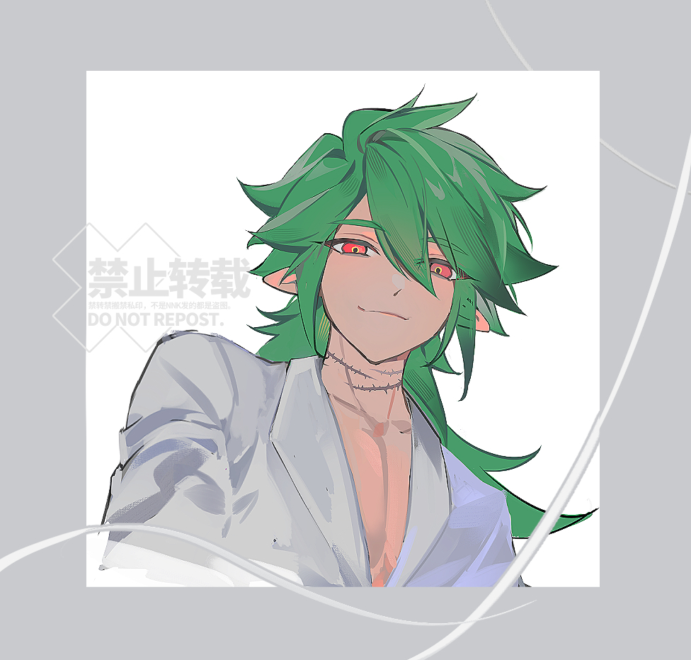 1boy alternate_costume aotu_world chinese_commentary closed_mouth collarbone green_hair hair_between_eyes jacket long_hair looking_at_viewer low_ponytail male_focus multicolored_eyes pectoral_cleavage pectorals pointy_ears ponytail red_eyes ribbon scar scar_on_neck simple_background smile solo upper_body watermark white_background white_jacket white_ribbon x-0601 xander_(aotu_world)