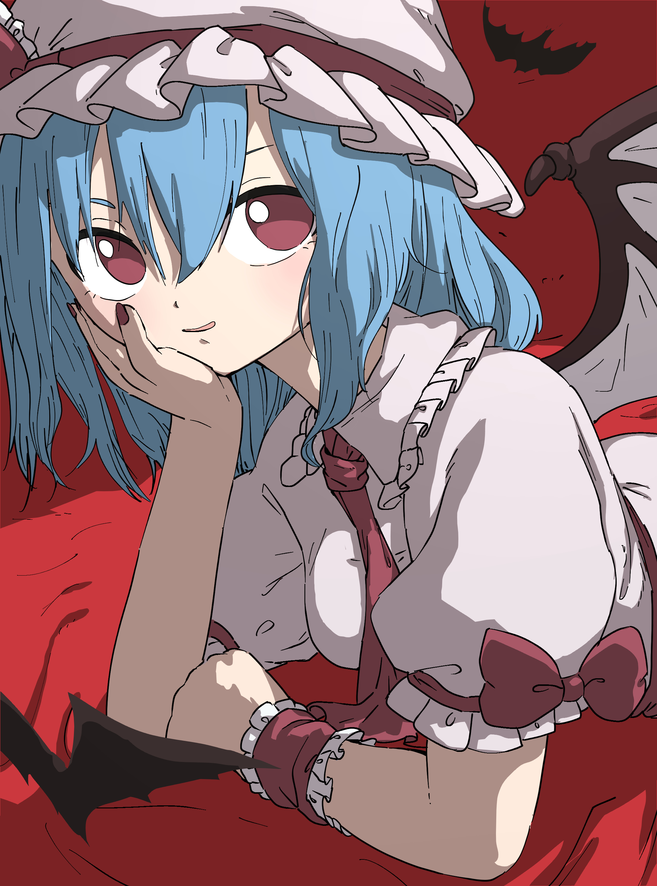 1girl absurdres bat_(animal) bat_wings blue_hair dress frills hair_between_eyes hat head_rest highres looking_at_viewer lying medium_hair mob_cap nail_polish neckerchief on_stomach red_background red_eyes red_nails red_neckerchief remilia_scarlet ribbon short_sleeves smile solo touhou upper_body uzou_(uzooooooooo) white_dress wings wrist_cuffs