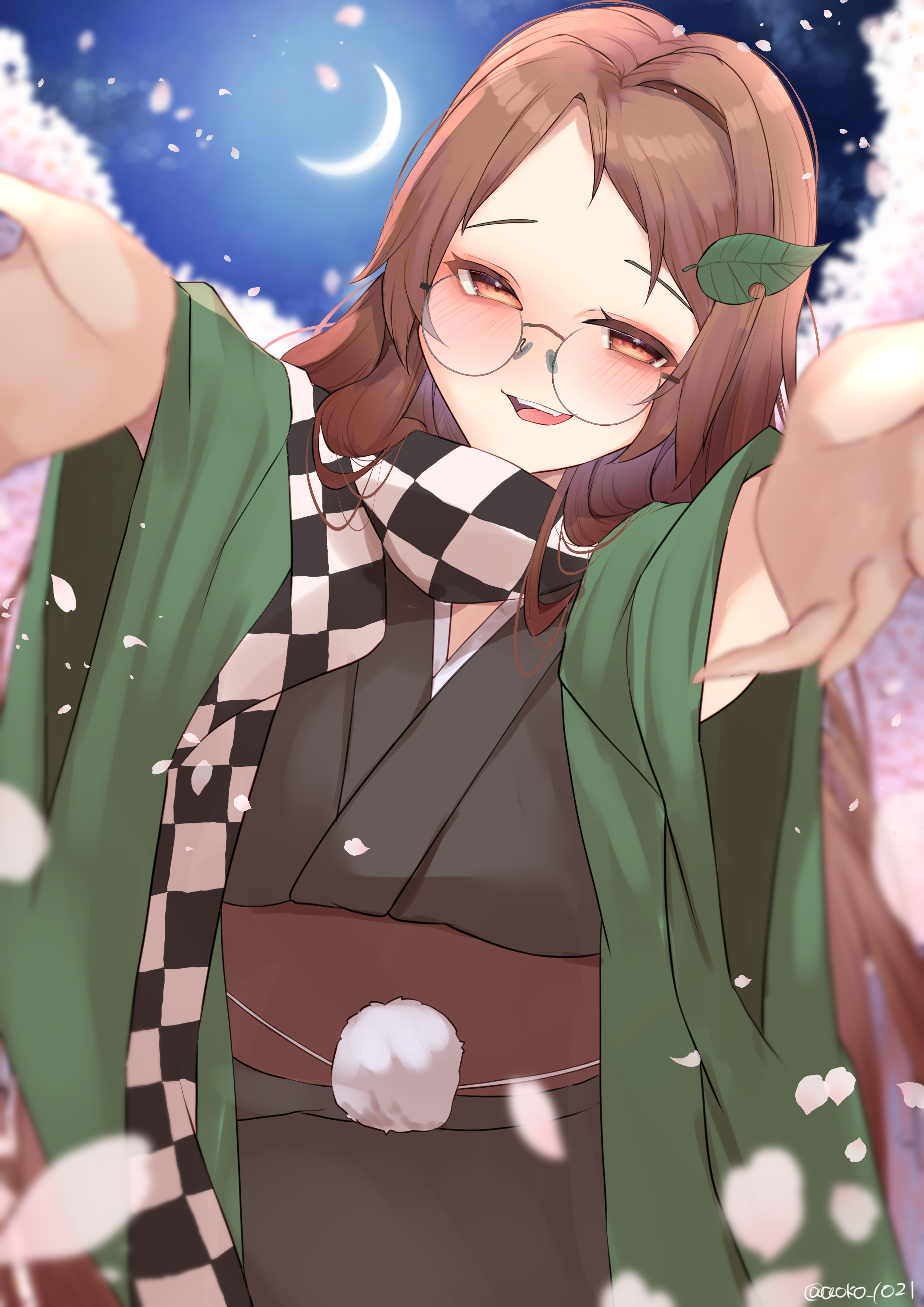 1girl absurdres aoko_(myut7287) black_kimono blush brown_eyes brown_hair checkered_clothes checkered_scarf cherry_blossoms crescent_moon futatsuiwa_mamizou futatsuiwa_mamizou_(human) glasses hair_ornament haori highres incoming_hug japanese_clothes kimono leaf_hair_ornament long_hair moon open_mouth petals round_eyewear scarf solo touhou twitter_username