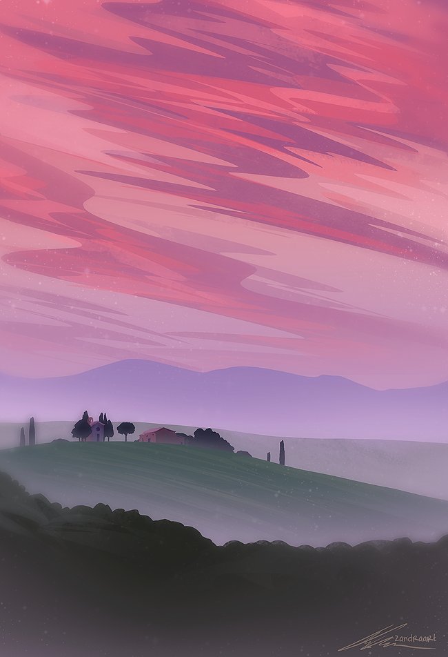 artist_name blurry depth_of_field fog forest hill house landscape mountainous_horizon nature no_humans original outdoors pink_sky rural scenery signature sky sunset tree variant_set zandra