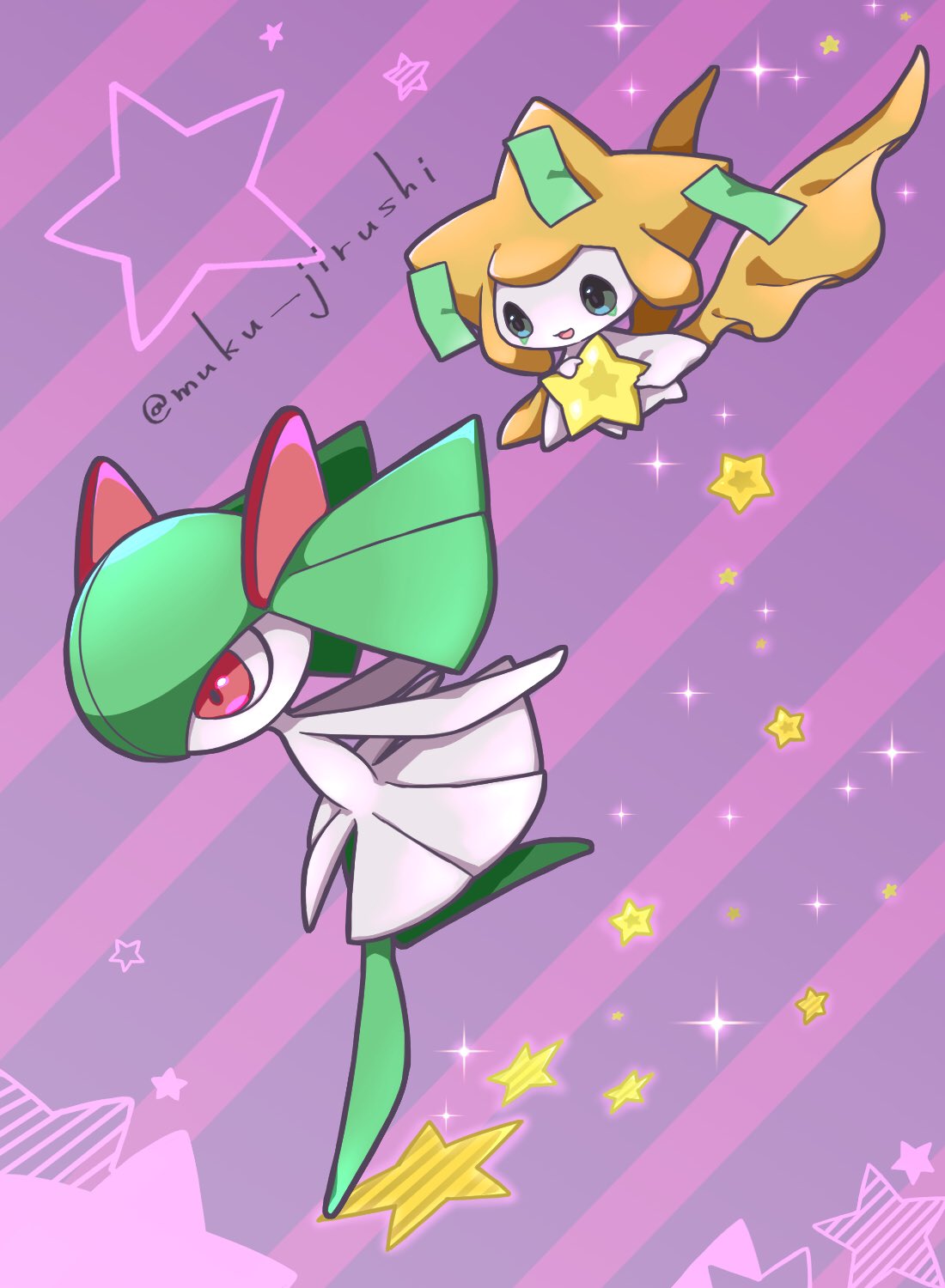 artist_name colored_skin gen_3_pokemon green_hair green_skin highres holding holding_star horns jirachi kirlia legendary_pokemon muku_jirushi multicolored_skin mythical_pokemon nintendo pink_eyes pokemon pokemon_(creature) purple_background sidelocks star_(symbol) tanzaku two-tone_skin white_skin