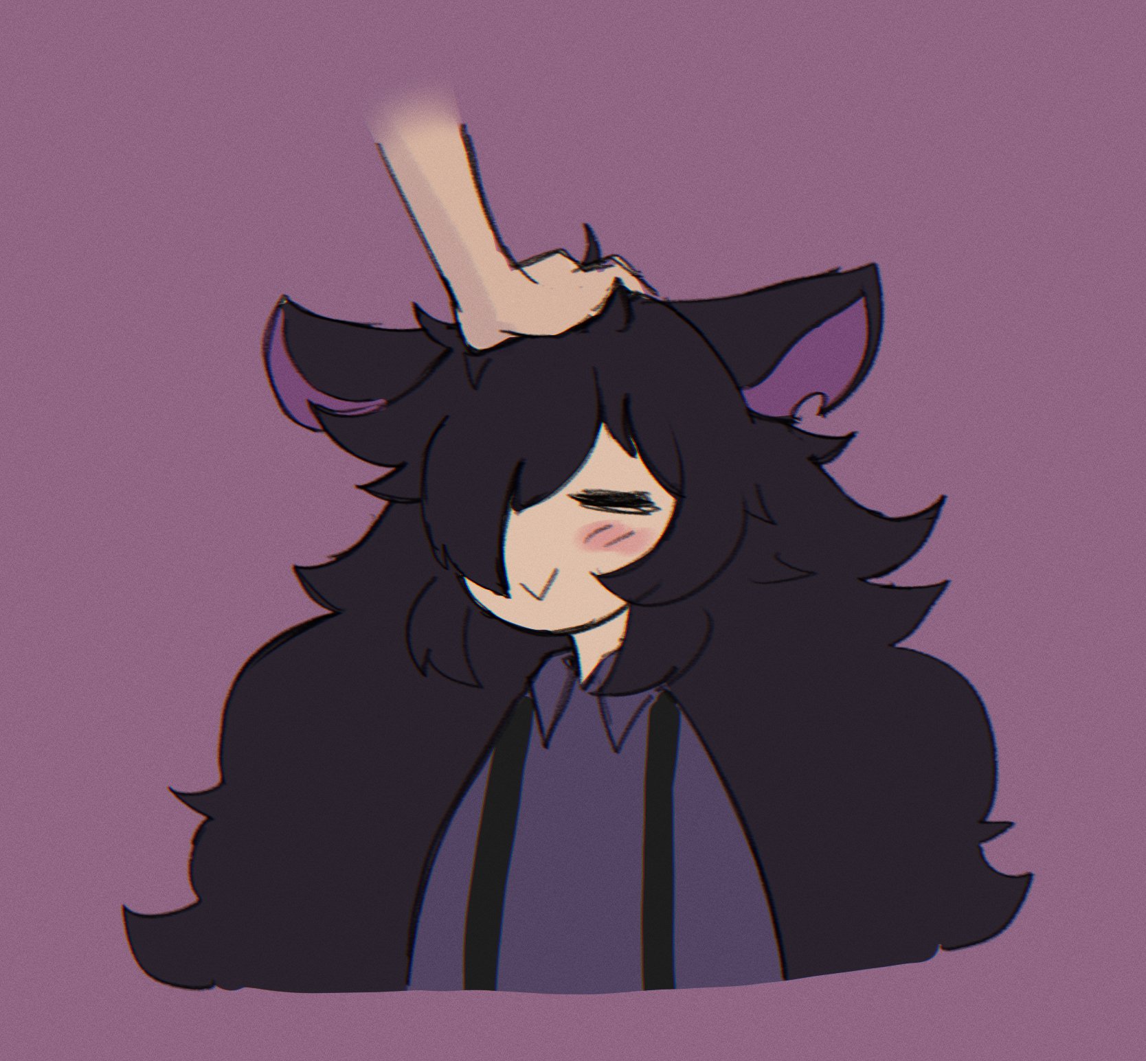 1girl 1other :> animal_ears black_hair blush borrowed_character closed_eyes closed_mouth collared_shirt disembodied_hand doce hair_over_one_eye headpat highres long_hair mouse_ears mouse_girl original purple_background purple_shirt shirt smile solo_focus suspenders upper_body
