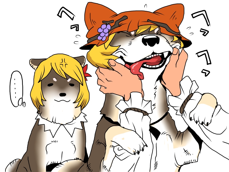 ... 1girl aki_minoriko aki_shizuha anger_vein animalization blonde_hair commentary_request dog female_pov grape_hat_ornament hat jealous looking_at_viewer mob_cap onikobe_rin orange_hat petting pov short_hair simple_background spoken_ellipsis touhou upper_body white_background yasaka_kanako