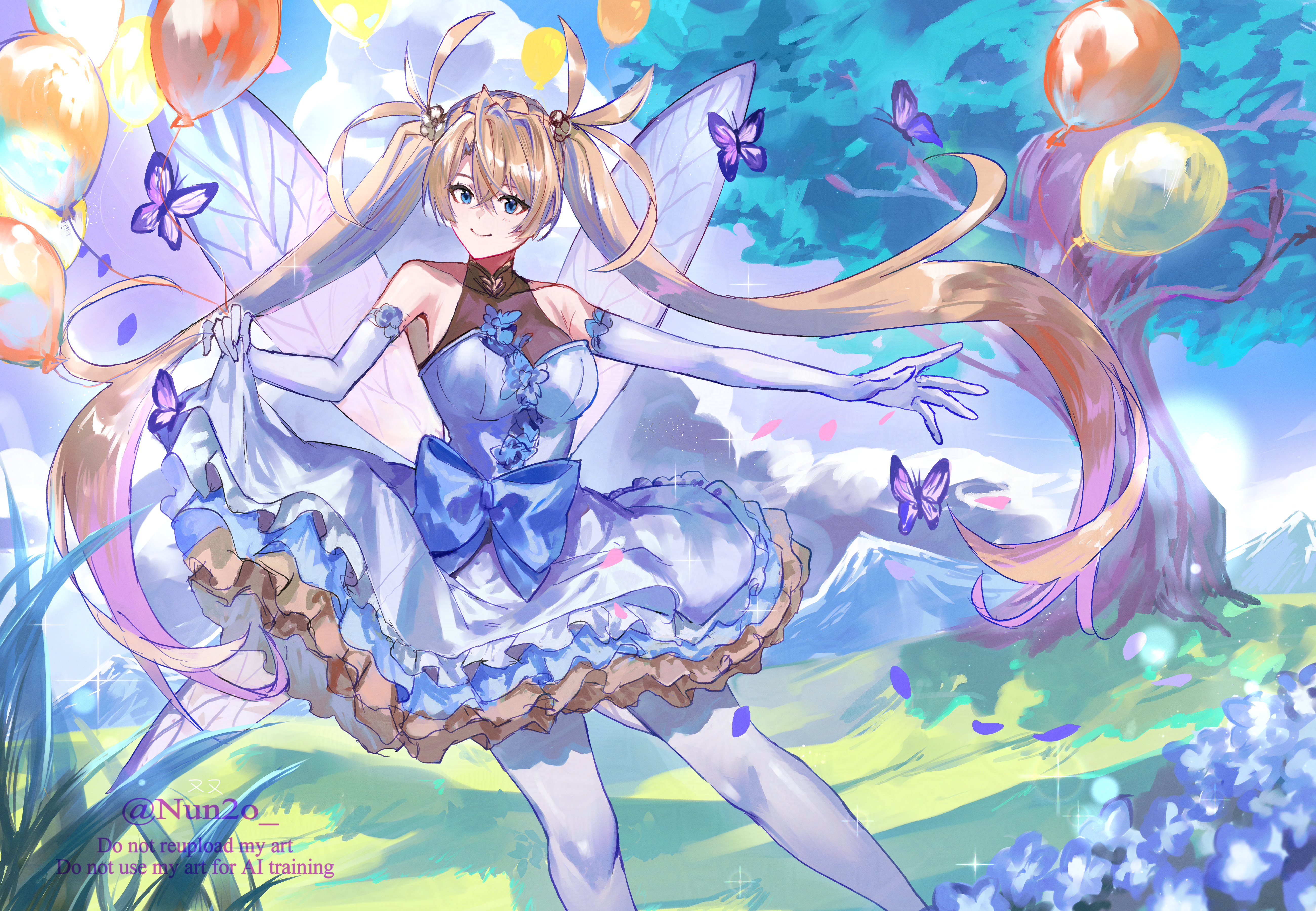 1girl absurdres balloon blonde_hair blue_bow blue_eyes bow bradamante_(fate) bradamante_(celebratory_attire)_(fate) breasts bug butterfly fairy_wings fate/grand_order fate_(series) highres insect large_breasts nun2o pantyhose skirt solo tree twintails twitter_username watermark white_pantyhose wings