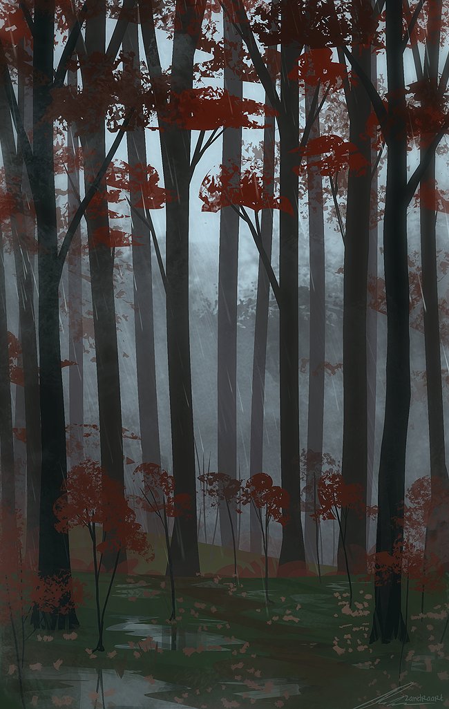 artist_name autumn blurry depth_of_field fog forest grass landscape nature no_humans original outdoors puddle scenery signature tree zandra