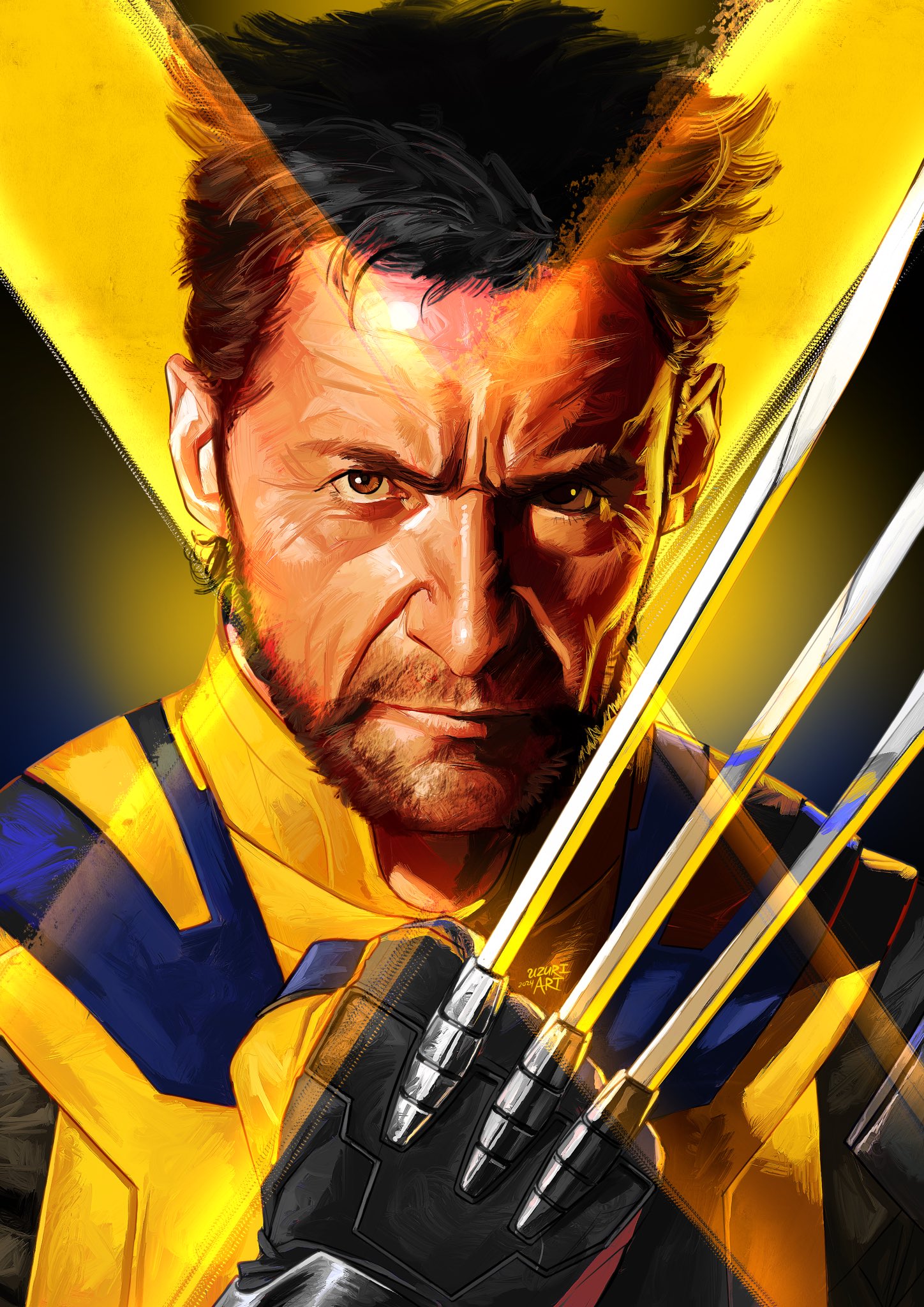 1boy artist_name beard black_background black_gloves blue_bodysuit bodysuit brown_eyes brown_hair claw_(weapon) closed_mouth commentary deadpool_&_wolverine deadpool_(series) english_commentary facial_hair gloves hand_up highres lips looking_at_viewer male_focus marvel multicolored_bodysuit short_hair solo two-tone_background two-tone_bodysuit uzuri_art v-shaped_eyebrows weapon wolverine_(x-men) x-men yellow_background yellow_bodysuit
