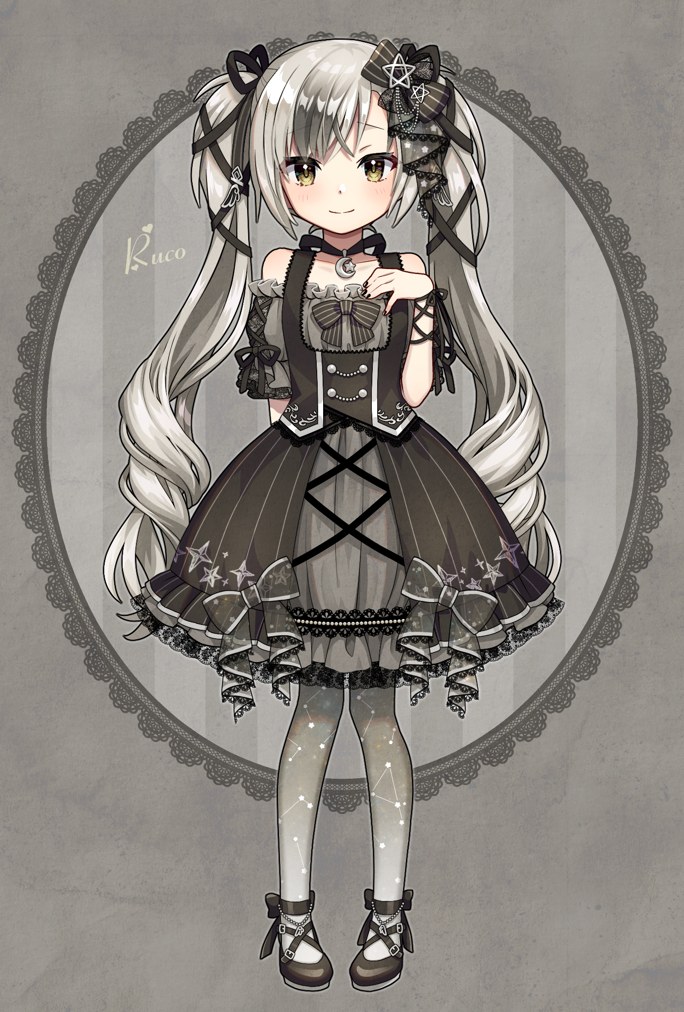 1boy bare_shoulders black_dress black_shoes blush closed_mouth commentary_request crossdressing crossdressing_(mtf) dress full_body grey_background grey_hair grey_pantyhose hair_ribbon hand_up highres long_hair looking_at_viewer male_focus nijisanji off-shoulder_dress off_shoulder official_alternate_costume pantyhose ribbon shoes shuu_(syuuuuuuuuuu) smile solo standing suzuki_masaru suzuki_masaru_(ruko) trap twintails virtual_youtuber yellow_eyes