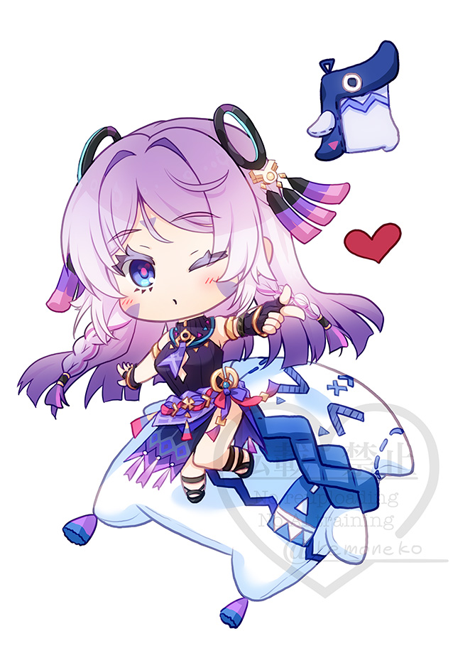 1girl black_gloves black_leotard blue_eyes blush braid chibi chibi_only citlali_(genshin_impact) citlalin_(genshin_impact) commentary_request facial_mark fingerless_gloves floating_headgear forehead_mark full_body furukawa_lemon genshin_impact gloves headgear heattech_leotard itzpapa_(genshin_impact) leotard long_hair looking_at_viewer multicolored_hair outstretched_arm pink_hair pink_pupils purple_hair simple_background solo triangle triangle_facial_mark turtleneck twin_braids very_long_hair white_background