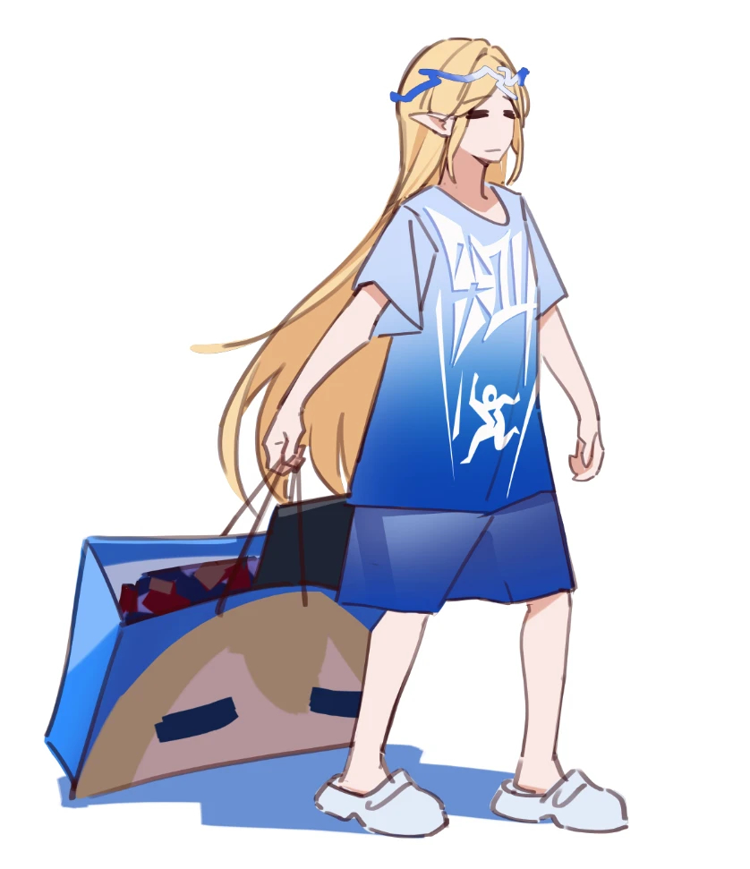 1girl alternate_costume azusa_hina bag bilingual_commentary blonde_hair blue_shirt blue_shorts cartethyia_(wuthering_waves) closed_eyes closed_mouth commentary english_commentary full_body girls'_frontline girls'_frontline_2:_exilium holding holding_bag long_hair mixed-language_commentary pointy_ears shirt shoes shorts sidelocks simple_background solo suomi_(girls'_frontline) suomi_(girls'_frontline_2) suomi_(midsummer_pixie)_(girls'_frontline) very_long_hair white_background white_shoes wuthering_waves