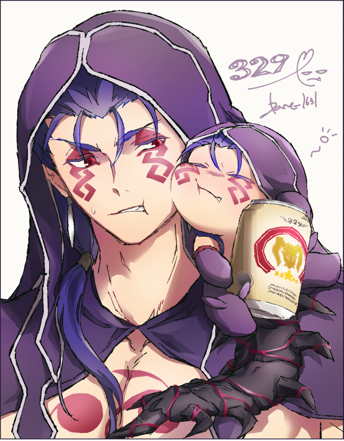 2boys beer_can blue_hair can cheek-to-cheek chibi chibi_on_shoulder cu_chulainn_(fate) cu_chulainn_alter_(fate) drink_can facial_mark fate/grand_order fate_(series) grimace heads_together hood hood_up long_hair male_focus mini_cu-chan_(fate) multiple_boys nuzzle pectorals ponytail red_eyes tail white_background yukota_2631