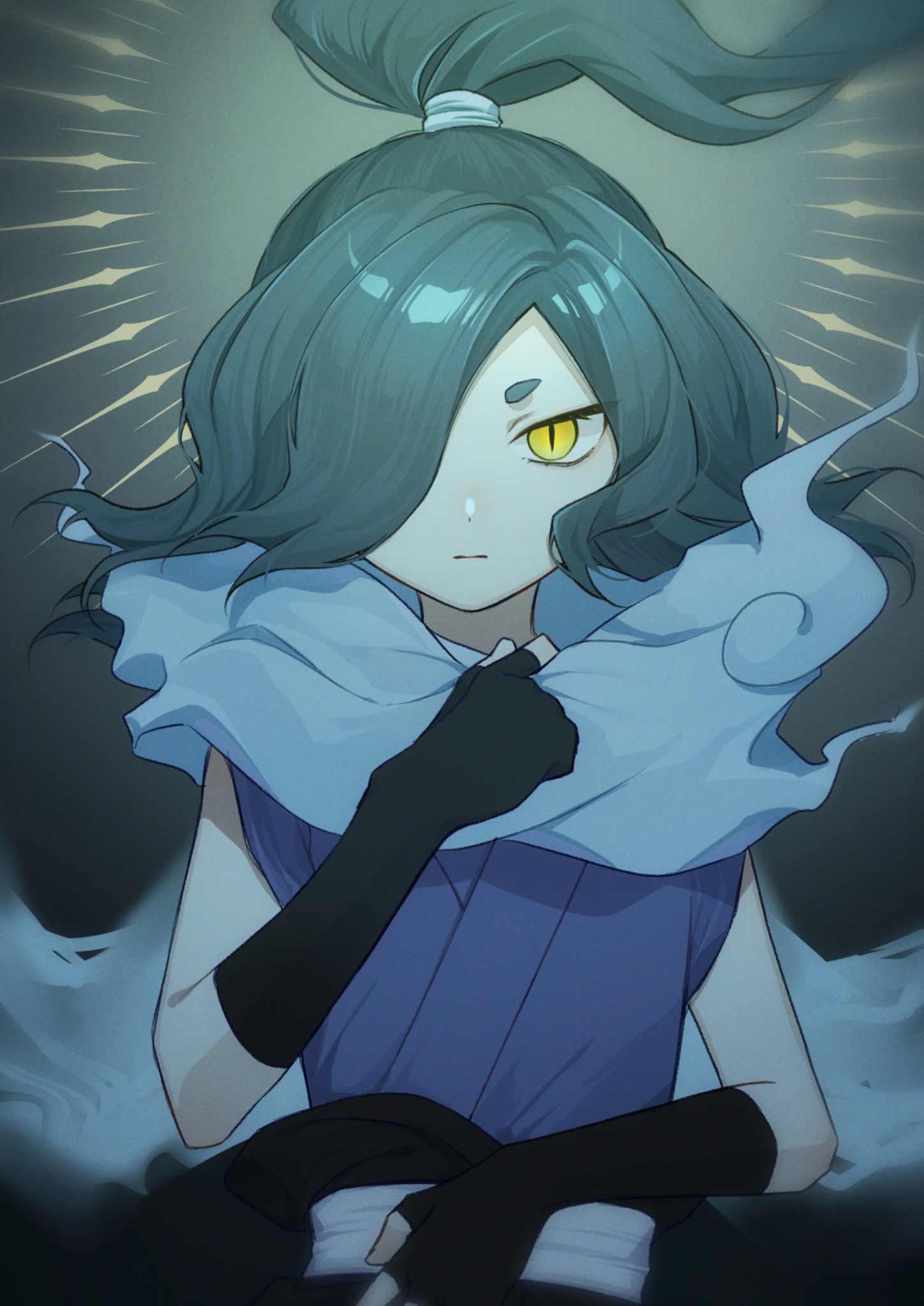 1boy black_gloves blue_hair djob7ycnem9 fingerless_gloves gloves hair_over_one_eye highres japanese_clothes looking_at_viewer orochi_(youkai_watch) pale_skin ponytail slit_pupils solo upper_body yellow_eyes youkai_(youkai_watch) youkai_watch
