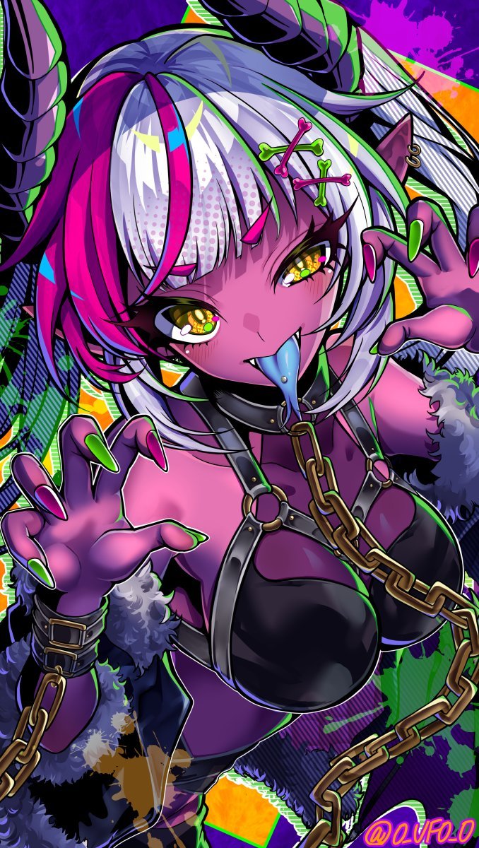 1girl adamusuki black_bra blue_tongue bra breasts chain colored_skin colored_tongue demon_horns forked_tongue green_nails highres horns looking_at_viewer multicolored_hair multicolored_nails nail_polish original piercing red_nails red_skin solo streaked_hair tongue tongue_out tongue_piercing twitter_username underwear white_hair yellow_eyes