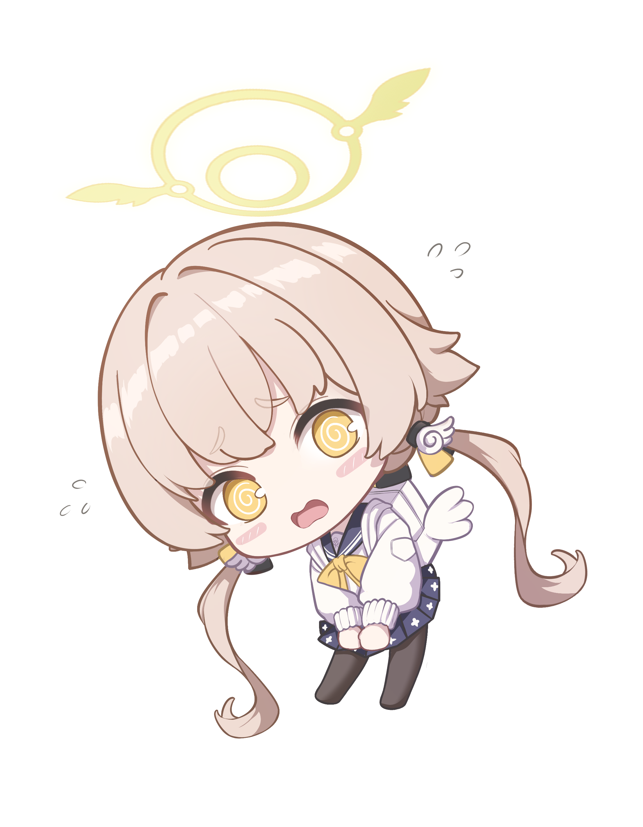 1girl @_@ absurdres backpack bag black_pantyhose black_skirt blonde_hair blue_archive chibi chibi_only flying_sweatdrops full_body halo hifumi_(blue_archive) highres hooming_illust long_sleeves low_twintails open_mouth pantyhose pleated_skirt ribbon shirt simple_background skirt solo twintails white_background white_bag white_shirt yellow_eyes yellow_halo yellow_ribbon