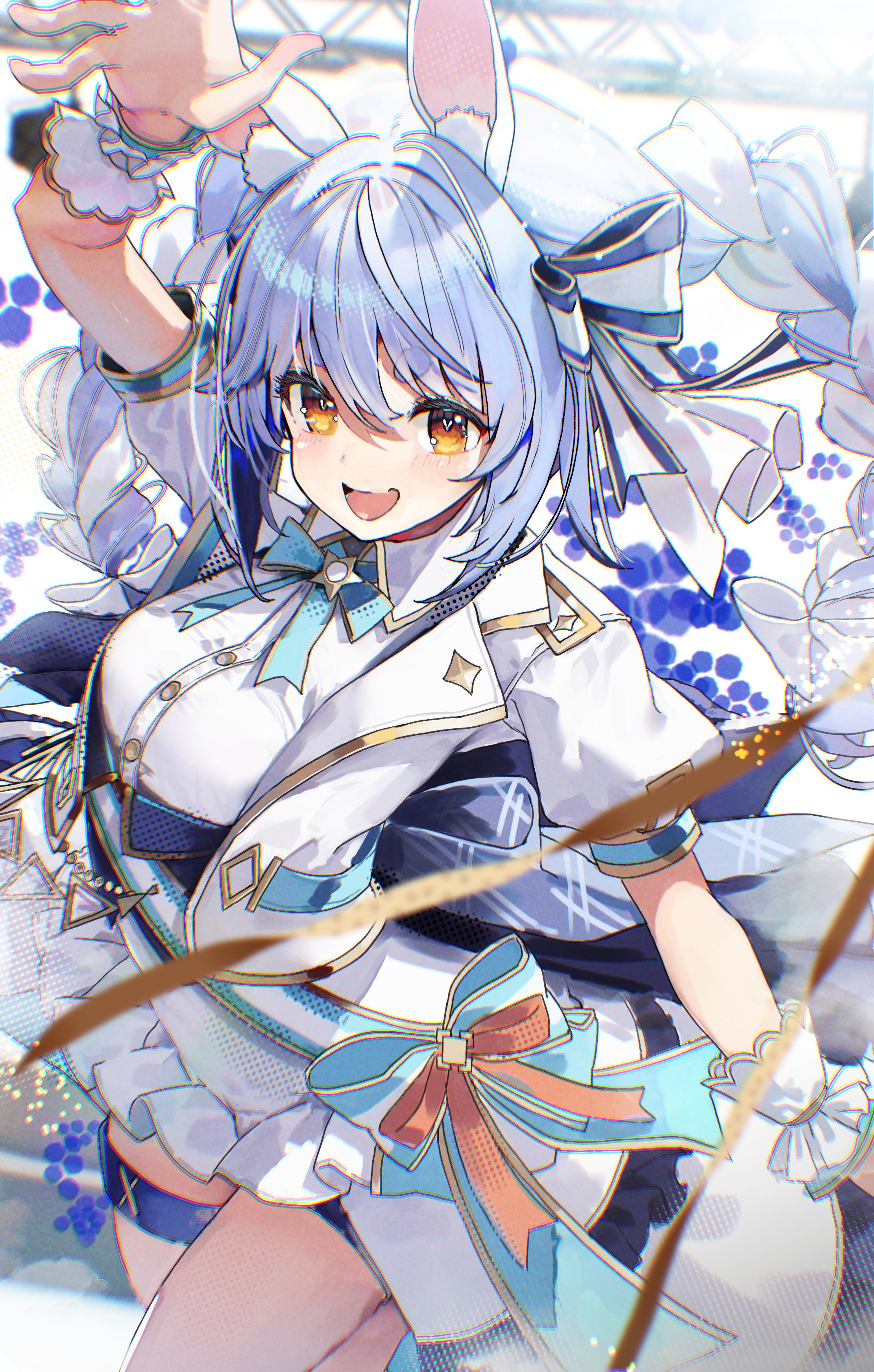 1girl :d absurdres animal_ears arm_up blue_hair bow braid corset hair_between_eyes haruhina_purple highres hikimayu hololive hololive_idol_uniform_(bright) idol_clothes jacket layered_skirt long_hair looking_at_viewer multicolored_hair official_alternate_costume open_mouth orange_eyes overskirt puffy_short_sleeves puffy_sleeves rabbit-shaped_pupils rabbit_ears rabbit_girl shirt short-sleeved_jacket short_eyebrows short_sleeves skirt smile solo swept_bangs symbol-shaped_pupils thick_eyebrows twin_braids twintails two-tone_hair underbust usada_pekora virtual_youtuber waist_bow white_hair white_jacket white_shirt white_skirt