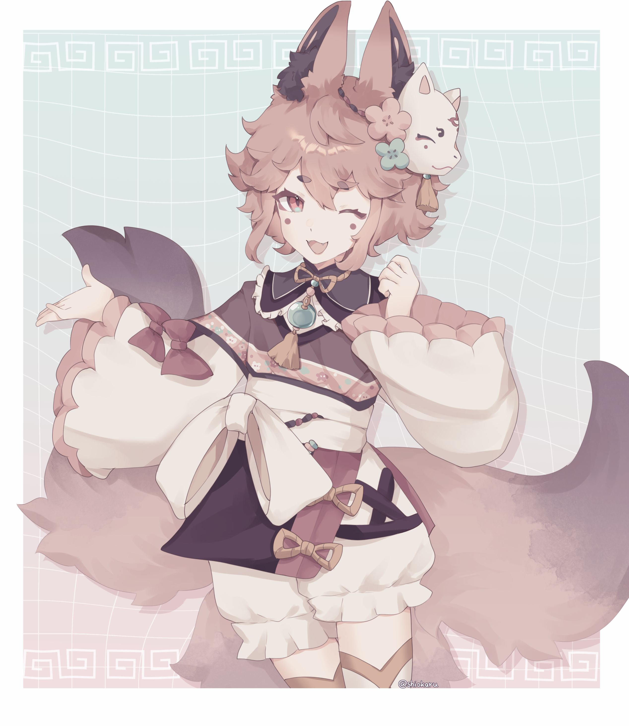 1boy :3 ;3 absurdres androgynous animal_ears border bow brown_capelet brown_hair brown_tail capelet clenched_hand commission cowboy_shot cowlick double-parted_bangs fangs flipped_hair flower fox_boy fox_ears fox_mask fox_tail gradient_background grid_background hair_flower hair_ornament hands_up happy highres kitsune light_smile lipgloss long_sleeves looking_at_viewer male_focus mark_under_both_eyes mask mask_on_head multiple_tails muted_color one_eye_closed open_hand open_mouth original outside_border red_bow red_eyes sash second-party_source shiokaru shirt short_hair shorts sleeve_bow solo tail tassel tassel_hair_ornament white_border white_mask white_sash white_shirt white_shorts wide_sleeves