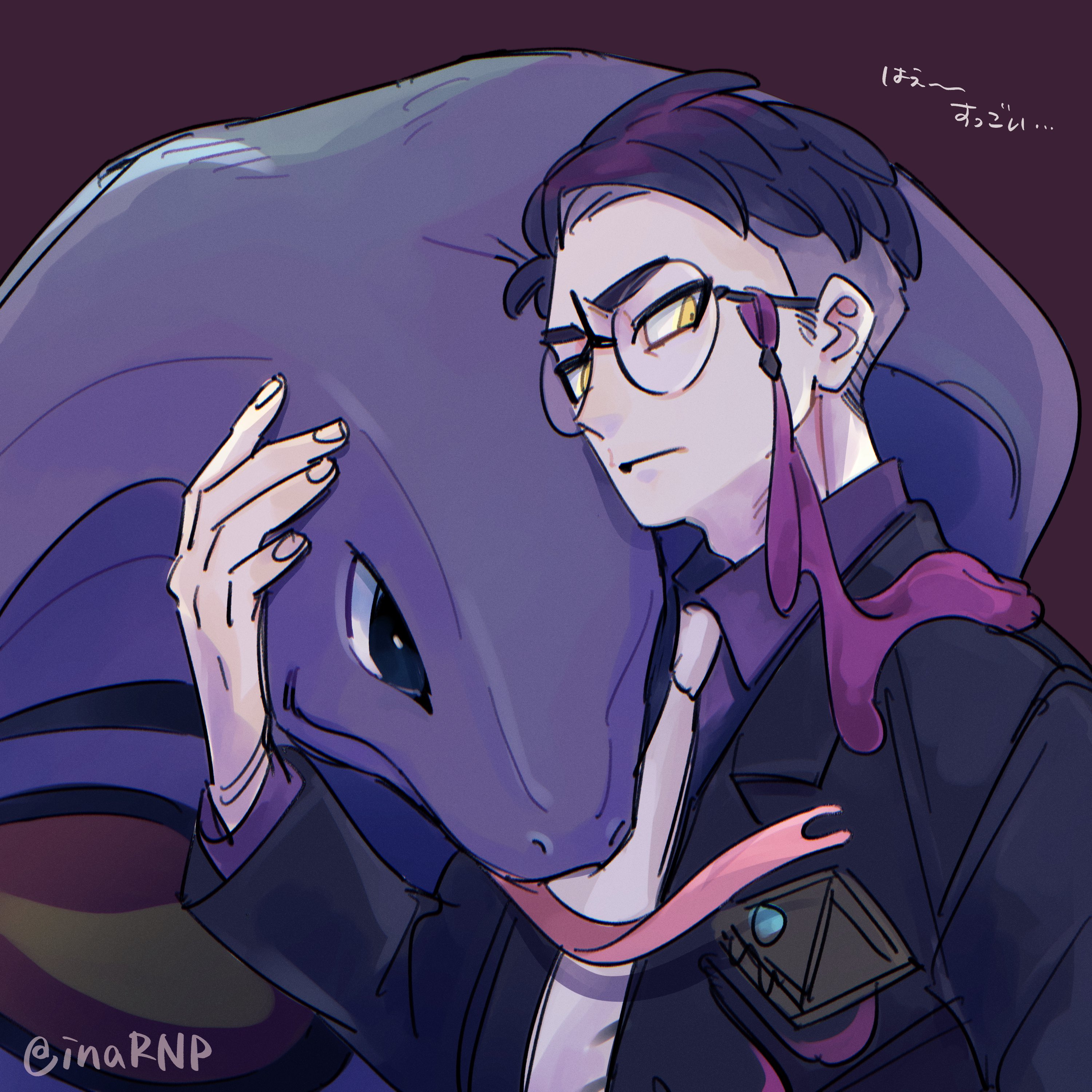 1boy absurdres arbok black-framed_eyewear black_hair black_jacket closed_mouth collared_shirt corbeau_(pokemon) gen_1_pokemon glasses highres inahara jacket long_sleeves necktie nintendo pokemon pokemon_(creature) pokemon_legends:_z-a purple_shirt round_eyewear shirt short_hair undercut upper_body white_necktie yellow_eyes