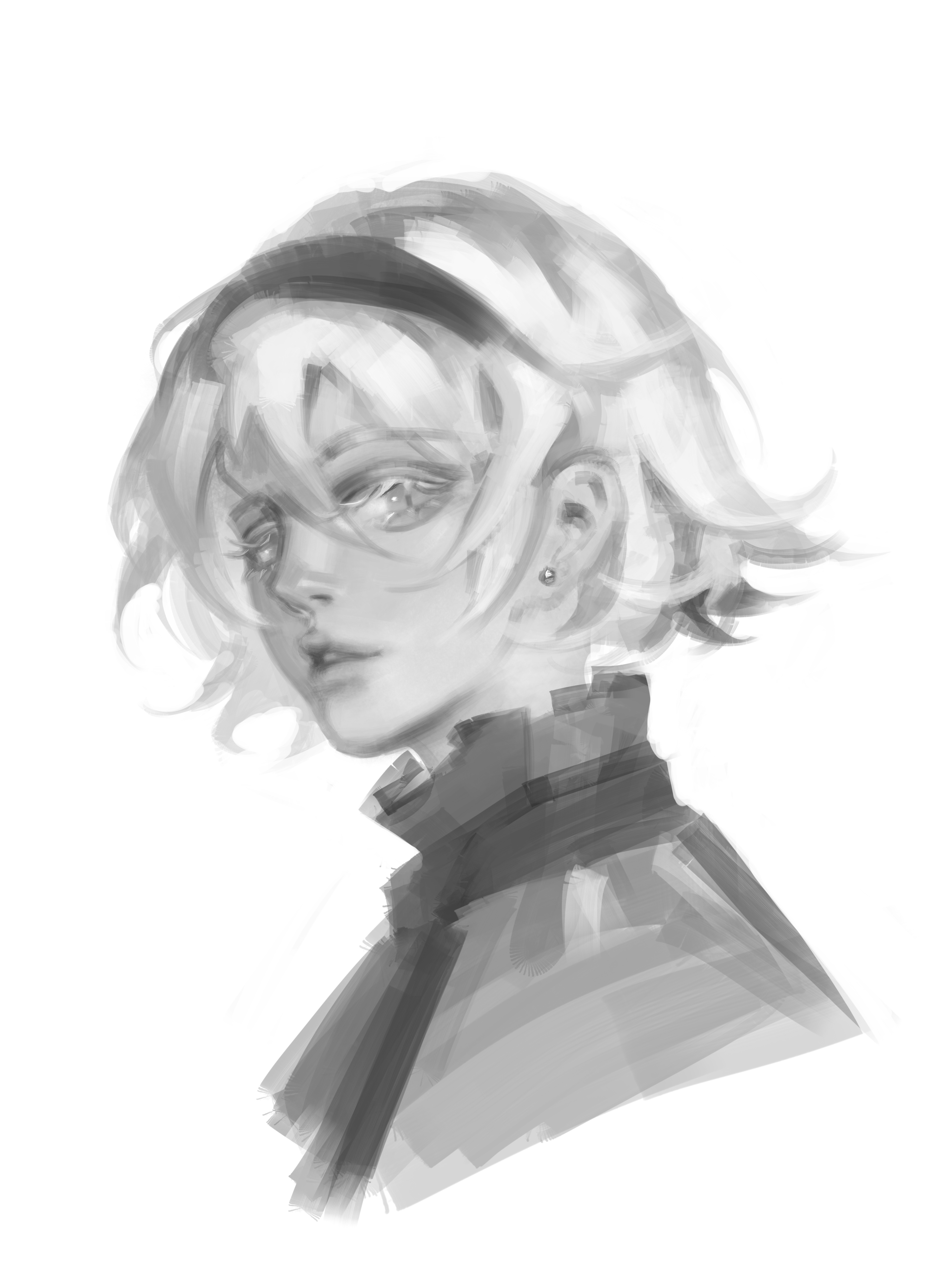 1girl absurdres alice_margatroid earrings expressionless greyscale hair_between_eyes highres jewelry kaoru_(alicemakoto) looking_at_viewer monochrome parted_lips short_hair simple_background solo white_background